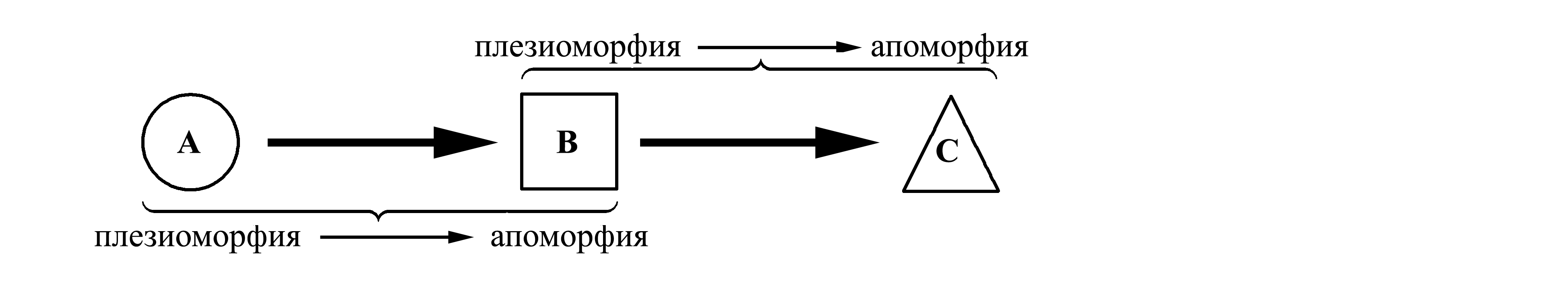 Термин апоморфия (apomorphia, от греческого απο- – от), или апоморфный признак, означает прогрессивный (в исходном значении этого слова, от латинского pro- – вперед и gressus – движение), т.е. продвинутый (или производный, вторичный) признак. Термин плезиоморфия (plesiomorphia, от греческого πλησιος – близкий), или плезиоморфный признак, означает примитивный (в исходном значении этого слова, от латинского primus, primitivus – первый, первичный) признак (называемый также исходным, анцестральным, предковым или генерализованным признаком). Плезиоморфия и апоморфия – это два альтернативных состояния признака, соответственно, до и после произошедшего с признаком эволюционного изменения. Эти понятия являются относительными: если эволюция идет от состояния A к состоянию B и далее к C, то B является апоморфией по отношению к A, но плезиоморфией по отношению к C. Представим себе, что в ходе эволюции форма какой-то части тела животного изменилась от круглой к квадратной и далее к треугольной; в этом случае квадратная форма будет апоморфией по отношению к круглой и плезиоморфией по отношению к треугольной: