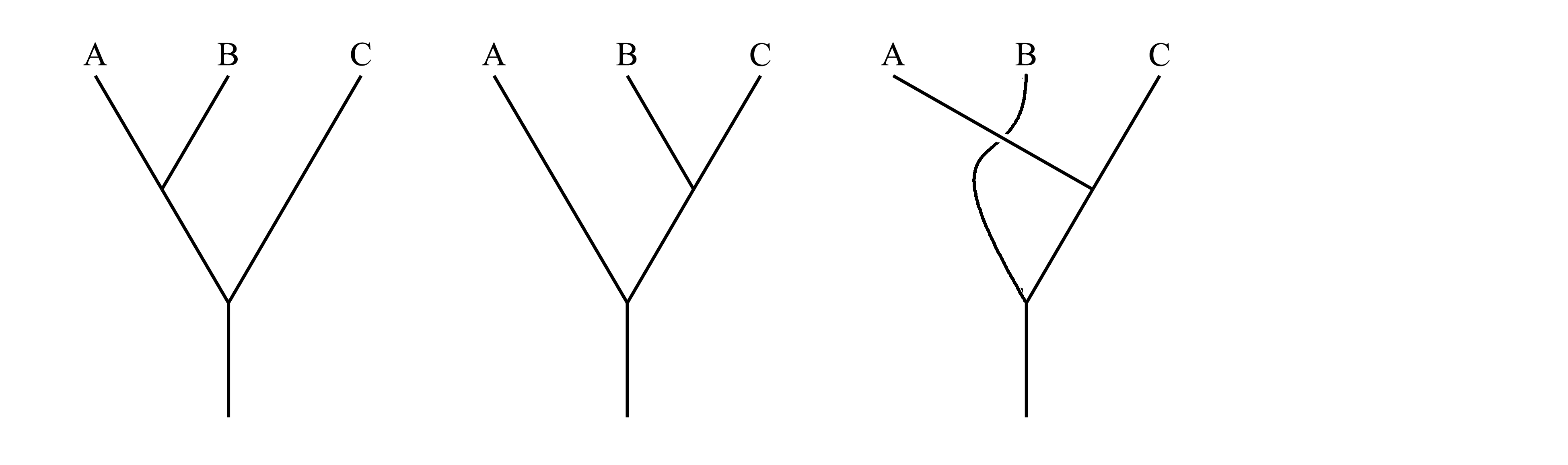 Задача о трех таксонах. Возьмем наиболее простую формальную задачу – выявление филогенетических отношений между тремя таксонами A, B и C. Если считать, что эволюция состоит из последовательных дивергенций, а разделение одного предка сразу на три или более ветвей маловероятно, то между тремя таксонами теоретически возможны три варианта филогенетических взаимоотношений: