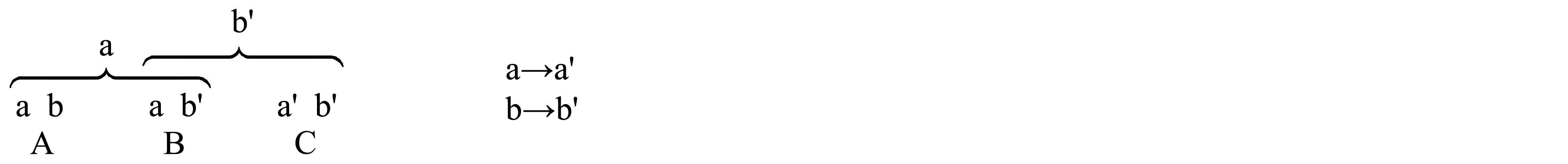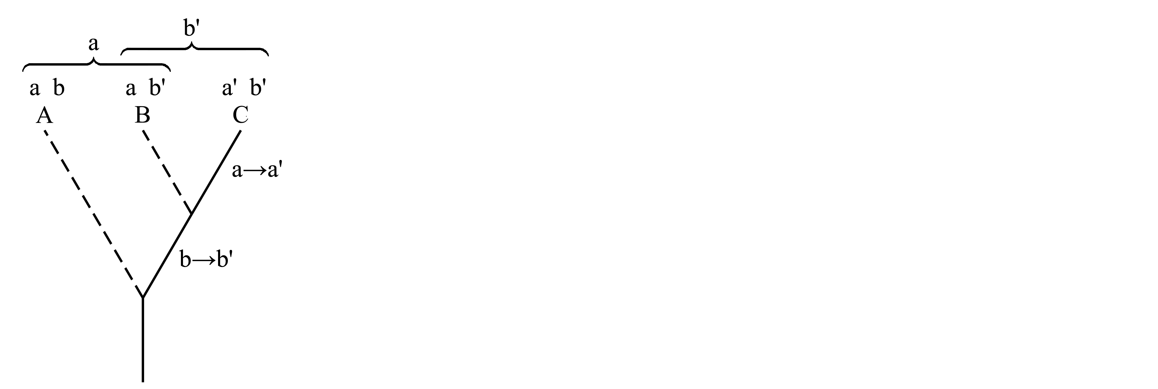 Для того, чтобы выяснить, какой из трех вариантов верный, необходимо проанализировать признаки этих трех таксонов. Обозначим маленькими буквами a, a', b и b' признаки, где a и a' являются двумя альтернативными состояниями одной детали строения, а признаки b и b' являются двумя альтернативными состояниями другой детали строения. Предположим, что признаки a и b являются плезиоморфиями, а признаки a' и b' – апоморфиями, то есть их эволюционные преобразования можно записать так: a→a' и b→b'. В нашем примере таксон A имеет признаки a и b, таксон B имеет признаки a и b', таксон C имеет признаки a' и b':