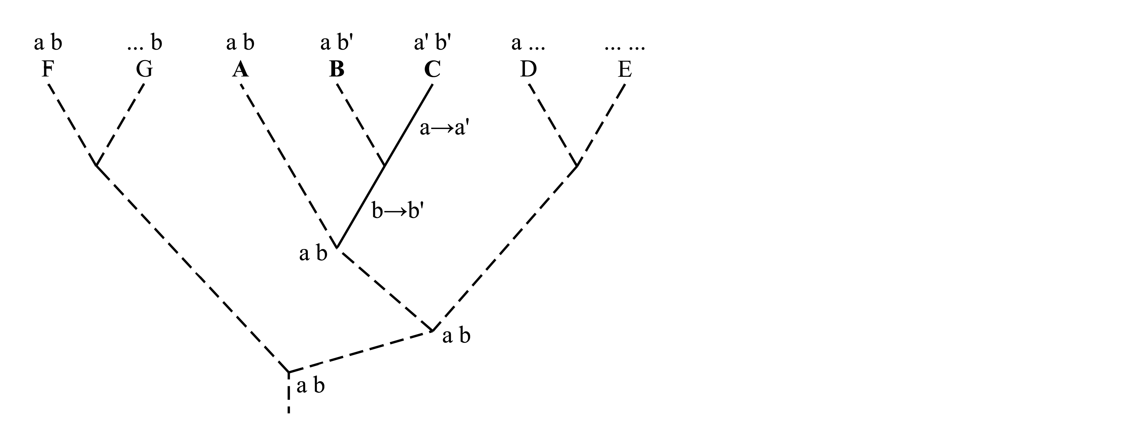 Мы получили обоснованную реконструкцию филогении, в которой каждое из эволюционных преобразований (a→a' и b→b') произошло однократно.