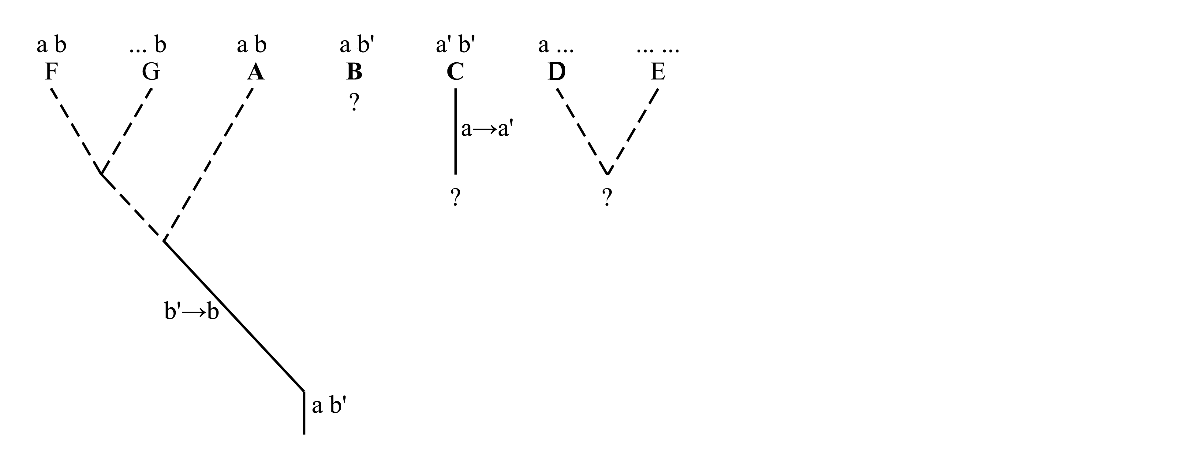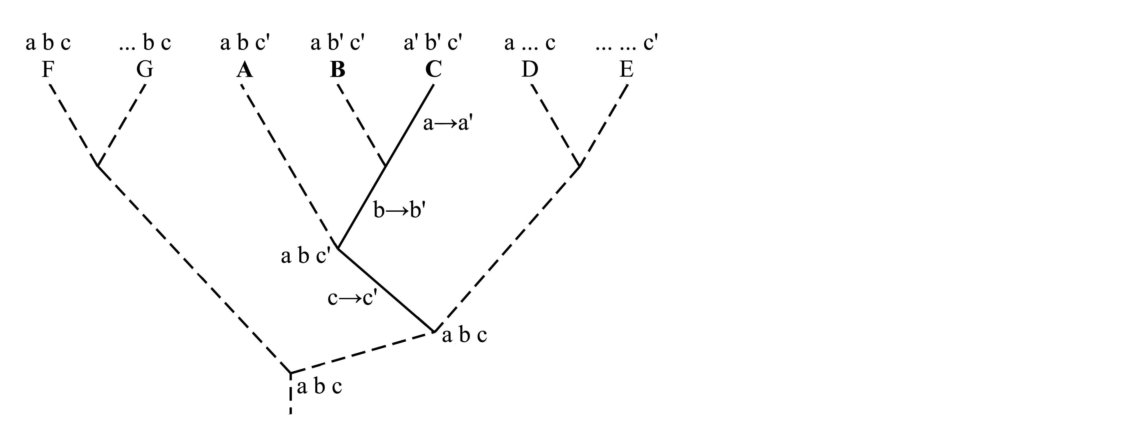 Однако приведенных здесь фактов недостаточно для доказательства именно такой полярности признаков a, a', b и b' и недостаточно для доказательства именно таких филогенетических взаимоотношений между таксонами A, B и C. Основываясь на том же распределении признаков, мы можем допустить совершенно иную их полярность и иное ветвление филогенетического древа: