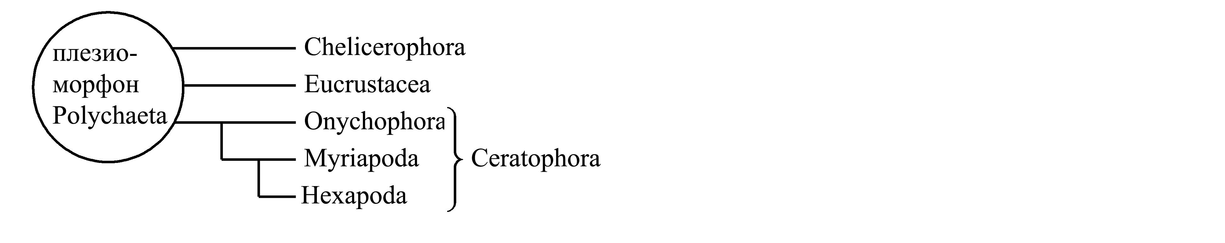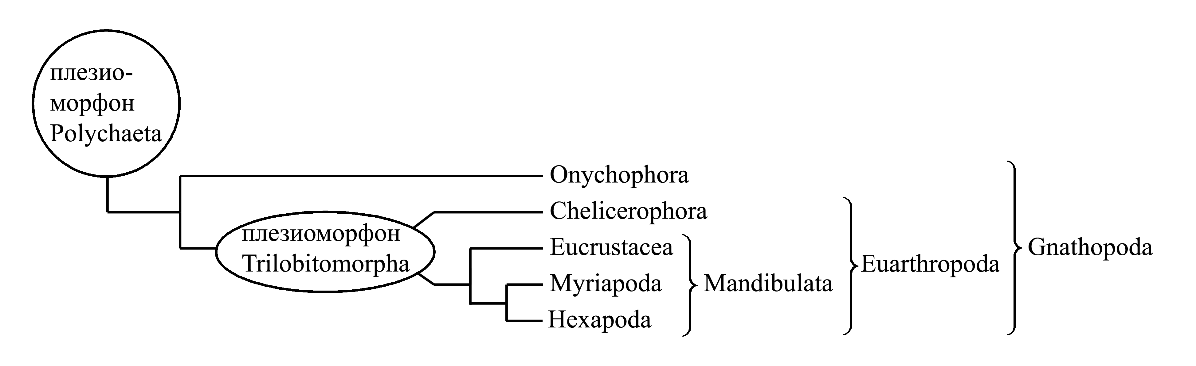 Например, взрослые ракообразные (Eucrustacea) имеют настолько разнообразное строение, что трудно назвать какие-либо общие признаки этого таксона; в то же время у всех Eucrustacea личинки (науплиусы) или поздние эмбрионы имеют явные черты сходства [см. главу IV: Eucrustacea (1)], что позволяет сделать вывод о филогенетической целостности этого таксона. При этом трудно представить себе, что науплиус повторяет строение общего предка ракообразных, поскольку он имеет несегментированное тело и лишь две пары крупных посторальных придатков (рис. 4.7.1E); судя по всему, ракообразные, будучи многосегментными животными, произошли от многосегментного членистоногого предка.