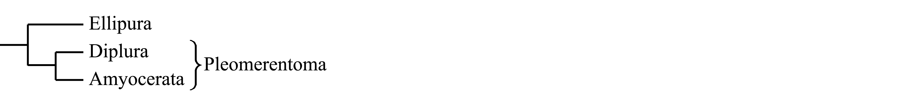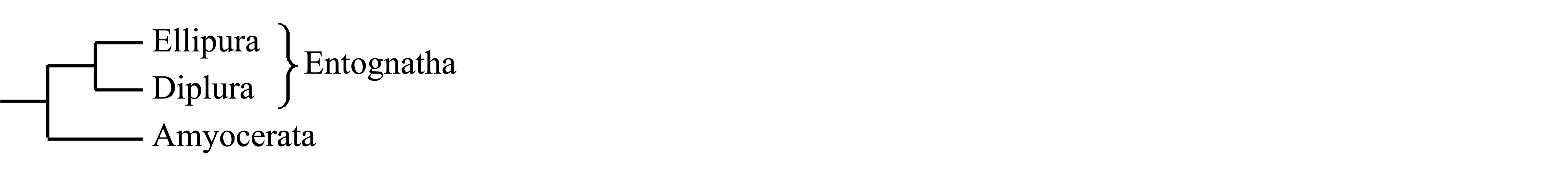 Например, признак таксона Entognatha [см. главу VI: Entognatha (1)] можно записать в виде одного слова: «скрыточелюстность». Этот же признак можно записать значительно длиннее (см. там же). Длинную запись можно сделать в виде одного сложносочиненного предложения, и тогда это будет считаться одним признаком. Можно эту же запись сделать в виде многих предложений, и пронумеровать каждое в отдельности, тогда все они будут считаться разными признаками. Точно так же признак таксона Pleomerentoma, касающийся строения придатков брюшка (см. главу VI: Hexapoda: «Классификации» III), можно записать в виде одного или нескольких предложений, считая их одним или несколькими признаками. Если предложений (т.е. подсчитываемых «признаков») в характеристике Entognatha окажется больше, чем в характеристике Pleomerentoma, получится следующая филогенетическая схема: