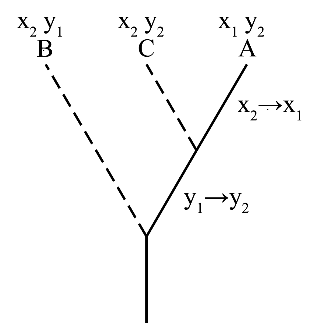 что: один из признаков x1 или x2 – апоморфия, другой – плезиоморфия; один из признаков y1 или y2 – апоморфия, другой – плезиоморфия. |
