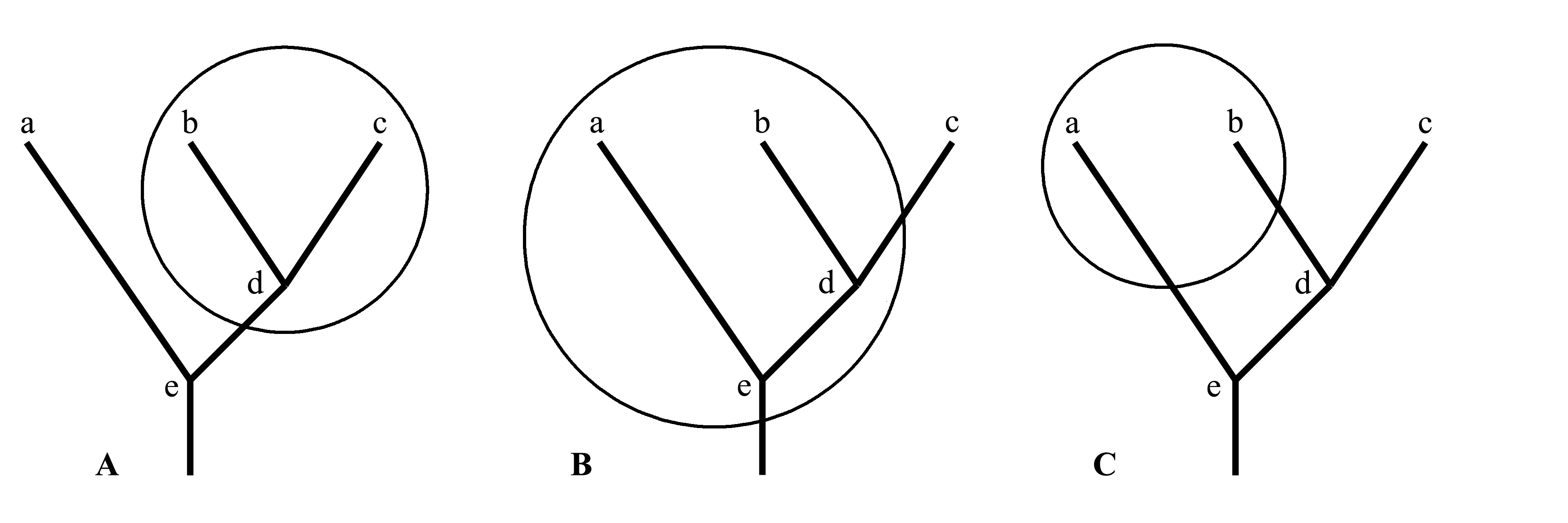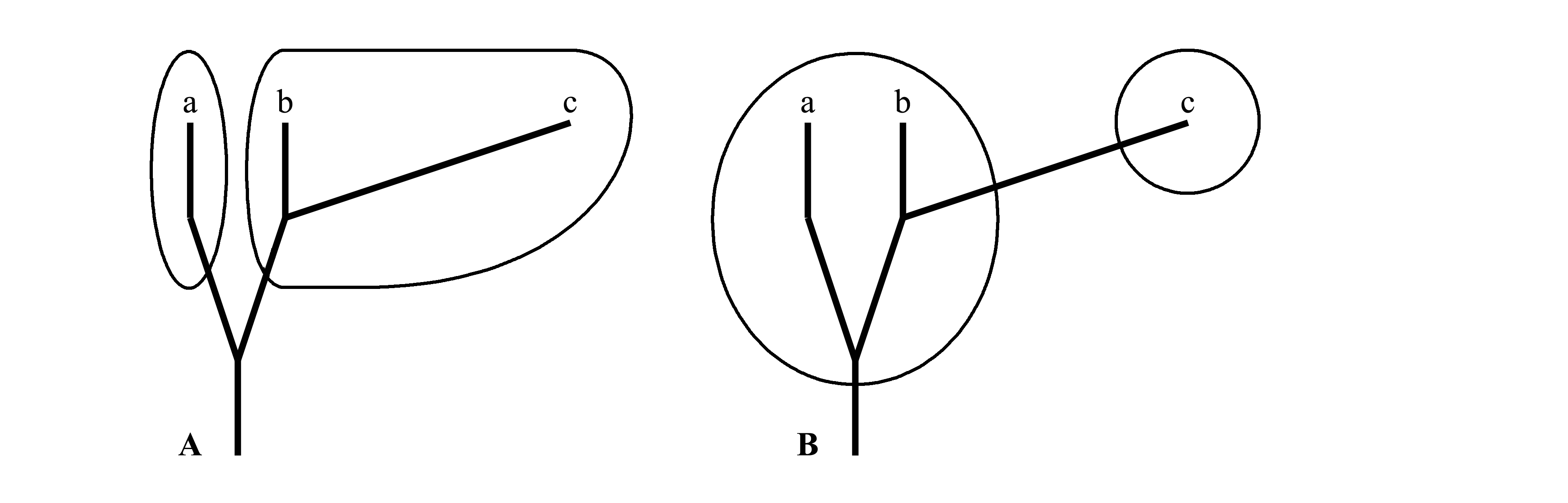 В-третьих, понятия голофилетический, парафилетический и полифилетический таксон являются абсолютными, в отличие от понятий апоморфный и плезиоморфный признак, которые являются относительными. Действительно, признак может быть апоморфным только по отношению к альтернативному ему признаку, который относительно его является плезиоморфным: признак B может быть апоморфным относительно признака A, но плезиоморфным относительно признака C (см. I.4.1.1). Таксон же является голофилетическим, парафилетическим или полифилетическим не относительно того или иного другого таксона, а вообще говоря. В определениях голо-, пара-, и полифилии фигурируют только естественные объекты «предок» и «потомки» и не упоминаются иные таксоны, кроме того таксона, к которому применяется определение. Например, если какие-либо потомки одного из членов таксона N не включены в таксон N, то таксон N называется парафилетическим независимо от того, как мы сгруппируем в таксоны этих потомков, не включенных в таксон N.