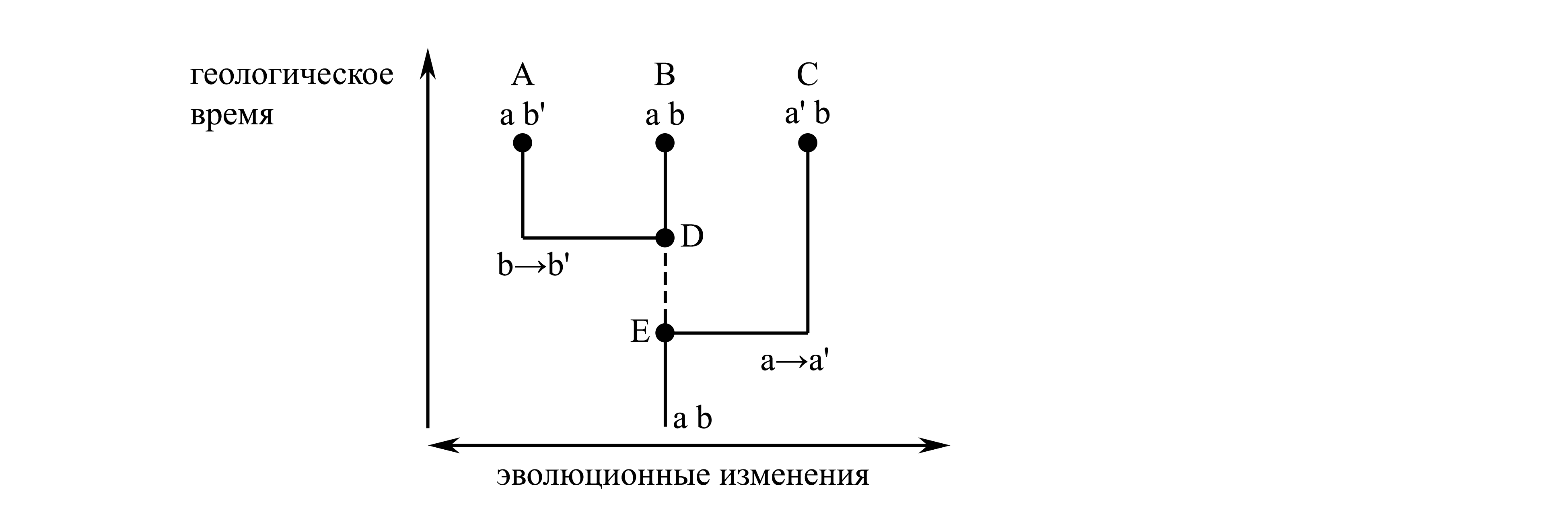 2. Полифилетический таксон (polyphylum). Полифилетическим называется таксон, не включающий в себя предка, общего для всех членов данного таксона, либо не включающий в себя какие-либо участки филогенетических ветвей, соединяющих общего предка таксона с каким-либо из его членов (точнее сказать, эти предки не удовлетворяют диагнозу таксона). Признаки, на которых основан диагноз полифилетического таксона, возникали в эволюции независимо несколько раз. На рис. 1.2C показан полифилетический таксон a+b. Если на филогенетической схеме обвести замкнутой линией полифилетический таксон, то эта линия пересечет филогенетическое древо более чем в одном месте – не менее двух раз на разных входах в таксон.