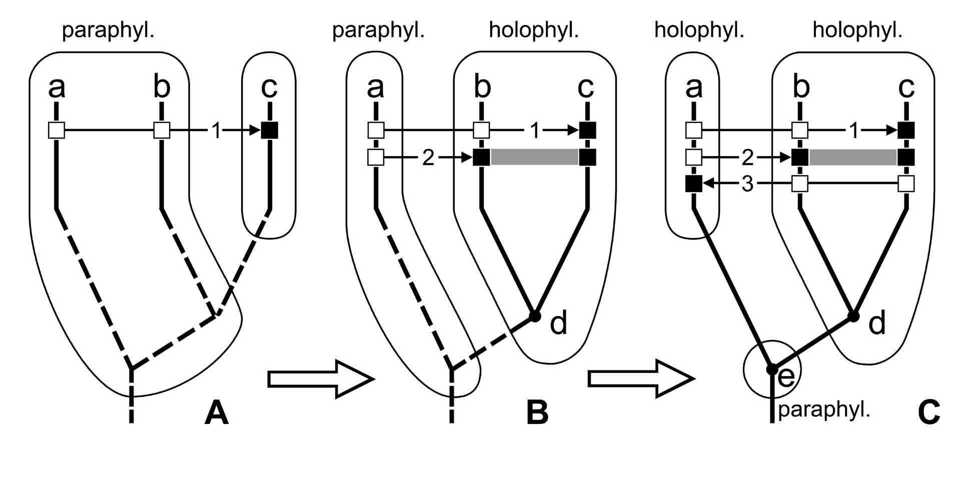 В-четвертых, понятия голо-, пара- или полифилетический таксон являются независимыми не только от классификации других таксонов, но и от признаков. Поскольку циркумскрипция (т.е. границы) таксона задается, как правило, с помощью признаков (образующих диагноз таксона), а филогения реконструируется на основе апоморфий (т.е. опять же признаков), создается неверное впечатление, что в основе всех этих понятий лежат признаки. Однако, как писал Линней, «не признак определяет род, но род определяет признак» – иными словами, признаки лишь помогают нам разобраться в этих понятиях, но не определяют их. Филогенетические связи существуют в природе независимо от того, сможем ли мы их реконструировать с помощью кладистического анализа (т.е. анализа признаков) или нет. Точно так же, если таксон включает своего общего предка и всех его потомков, этот таксон является голофилетическим, независимо от того, входят ли в его диагноз аутапоморфии или нет; если в его диагноз входят аутапоморфии, они являются для нас доказательством его голофилии; если аутапоморфии неизвестны или отсутствуют, мы не знаем, является ли данный таксон голофилетическим, но от этого нашего незнания он не перестает быть голофилетическим. Наличие в диагнозе таксона апоморфий – это не определение голофилии, а лишь способ ее выявления; но, поскольку этот способ выявления голофилии является единственным известным, некоторые ошибочно думают, что это и есть определение.