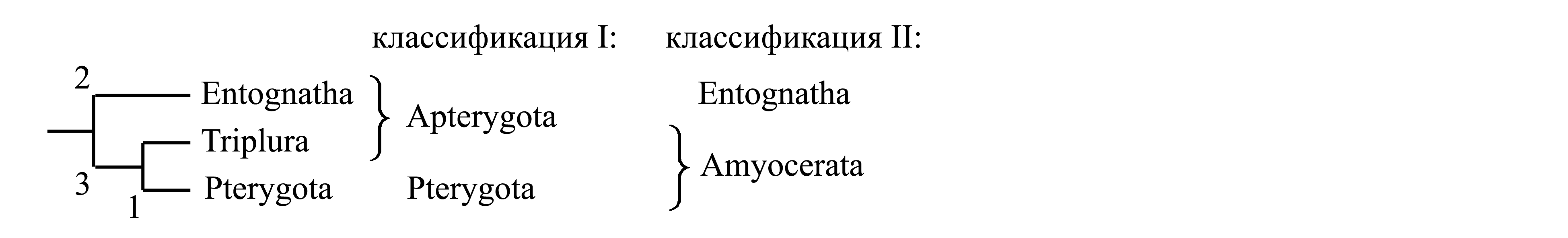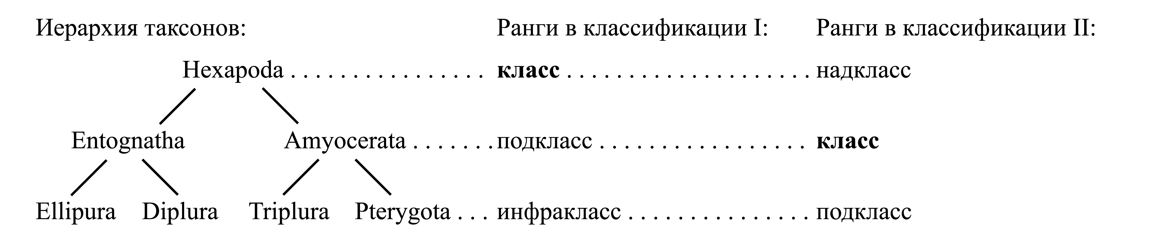 Для примера возьмем классификацию насекомых, записанную без рангов, и припишем этим группам ранги двумя разными способами (в современной литературе используется гораздо больше разных способов расстановки рангов для этих таксонов):
