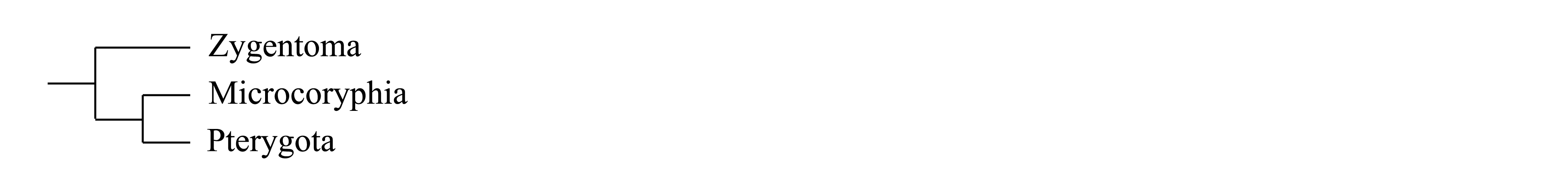 III. Деление Amyocerata на Triplura и Pterygota. Поскольку ни одна из двух вышеназванных гипотез не доказана, не исключена и третья гипотеза, по которой Triplura является голофилетическим таксоном, сестринским Pterygota. Zygentoma и Microcoryphia имеют много общих признаков, на основании которых их традиционно объединяют. Большая часть их общих признаков являются симплезиоморфиями, т.е. не доказывают голофилии Triplura. Однако среди общих признаков Triplura имеются и аутапоморфии, свидетельствующие о голофилии этого таксона [см. ниже, Triplura (1)–(4)].