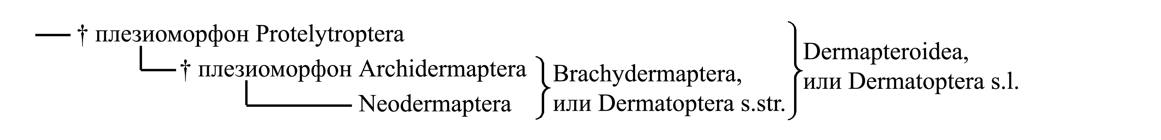 Классификация Dermapteroidea. Dermapteroidea (или Dermatoptera s.1) делятся на вымерший плезиоморфон Protelytroptera и представленный в современной фауне таксон Brachydermaptera (или Dermatoptera s.2).