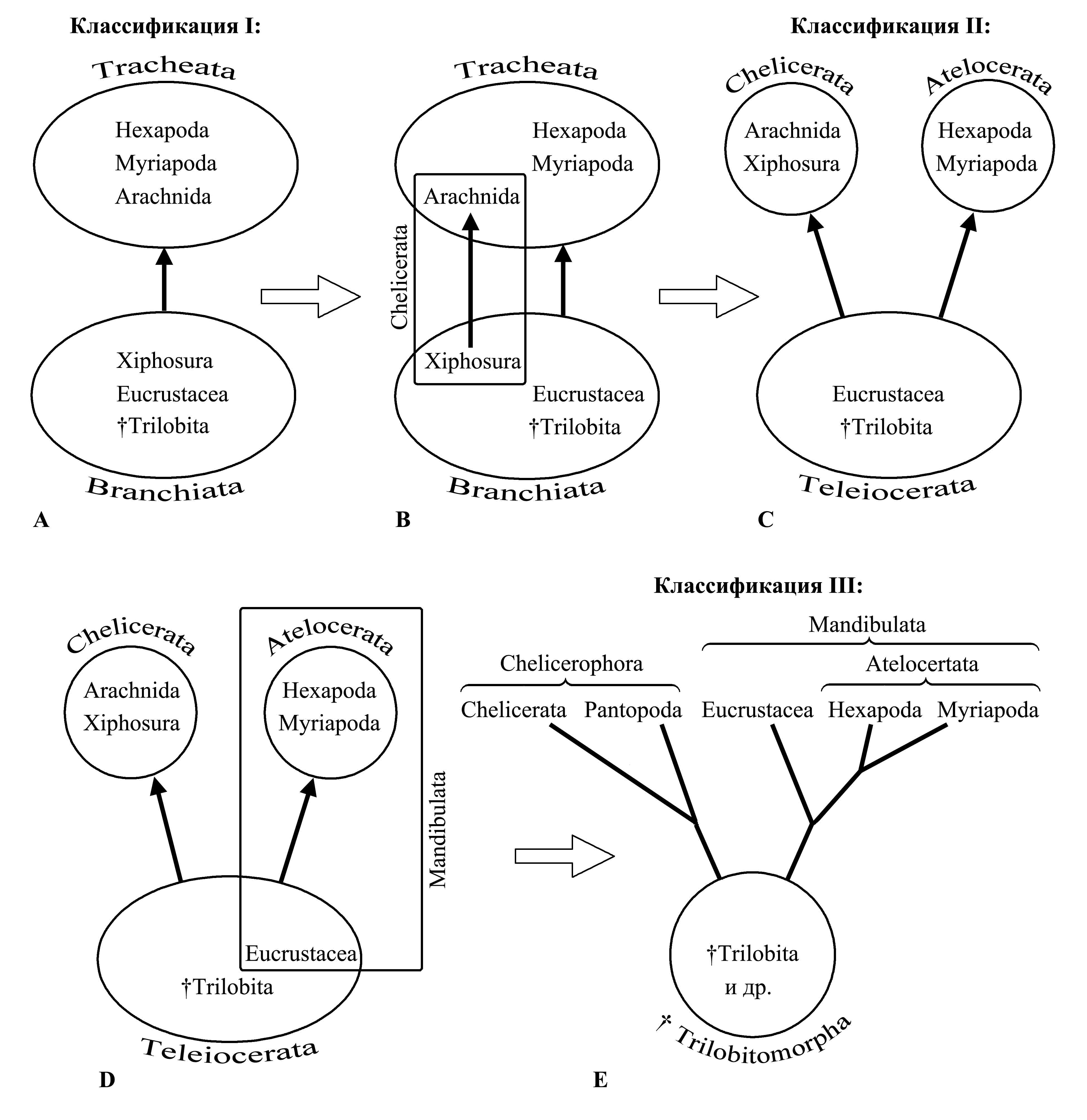 Рис. 4.4.2. Изменения классификации членистоногих в результате уточнения и исправления представлений об их филогении. Черными линиями обозначены филогенетические ветви, стрелками – направления эволюции; светлыми стрелками обозначены изменения классификации. Номера классификаций соответствуют номерам в разделе «Классификации Euarthropoda». A – традиционная классификация (Haeckel 1866 и др.); B – выявление полифилии Tracheata благодаря обнаружению синапоморфий Xiphosura и Arachnida (Lankester 1881); C – классификация с учетом синапоморфий Xiphosura и Arachnida (Heymons 1901); D – выявление синапоморфий Eucrustacea и Atelocerata; E – классификация с учетом синапоморфий Eucrustacea и Atelocerata (Snodgrass 1935).