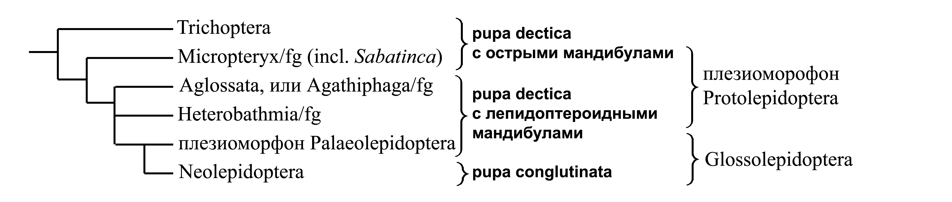 Уникальная лепидоптероидная форма куколочных мандибул, несомненно возникла в ходе эволюции однократно. Относительно того, аутапоморфией какого именно таксона является этот признак, возможны следующие два предположения. (1) Лепидоптероидная форма мандибул – это аутапоморфия Lepidoptera; в этом случае у Micropterix/fg (incl. Sabatinca) куколочные мандибулы вторично упростились, став похожими на мандибулы куколок ручейников и других «pupa dectica». (2) Лепидоптероидная форма мандибул – это аутапоморфия таксона, объединяющего Aglossata, Heterobathmia/fg и Glossolepidoptera; в этом случае у Micropterix/fg (incl. Sabatinca) куколочные мандибулы сохраняют строение, исходное для Amphiesmenoptera (см. ниже, Protolepidoptera «Статус и классификация»).