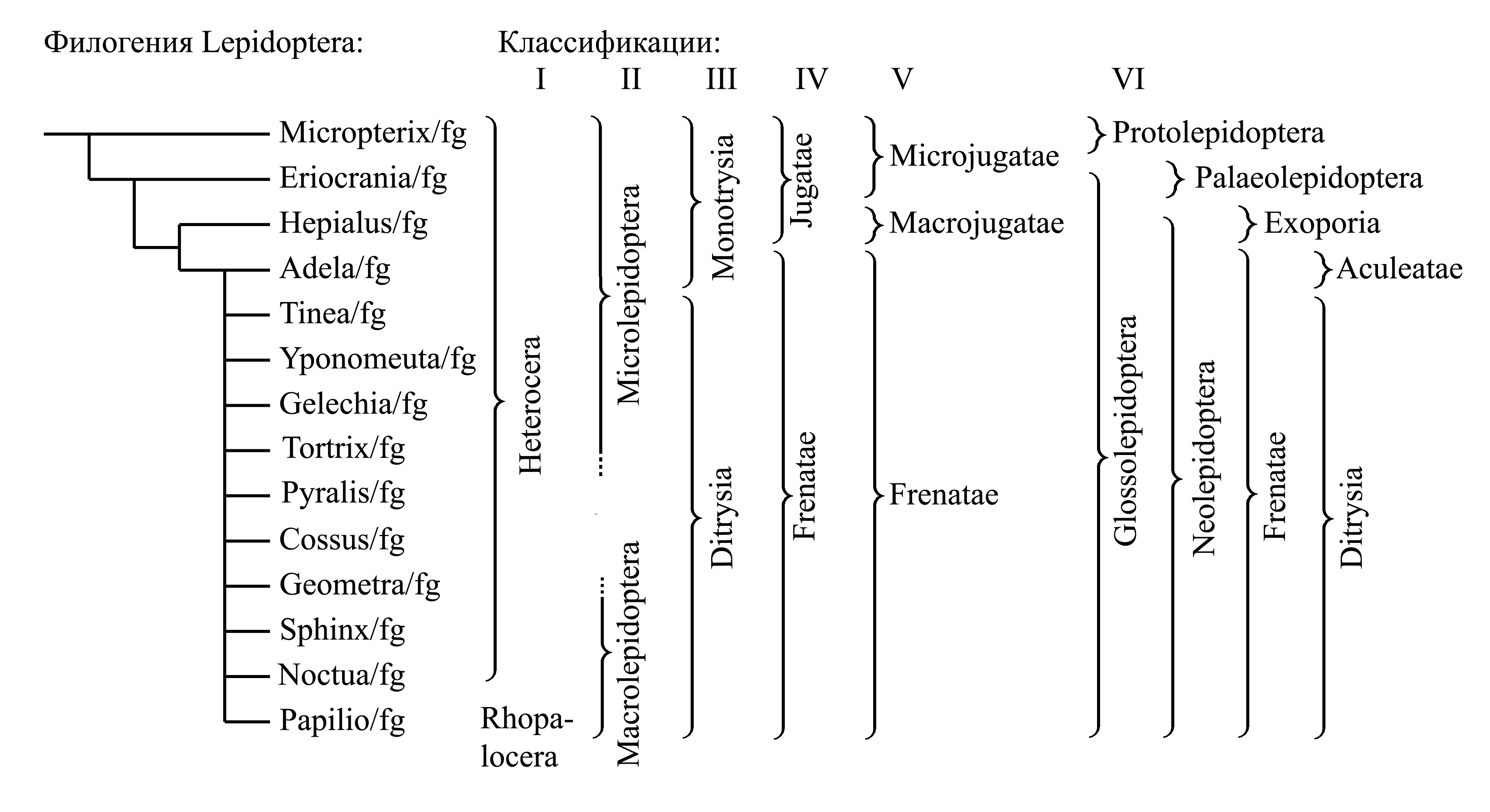 В упрощенном виде филогения Lepidoptera и соотношение классификаций I–VI выглядят следующим образом: