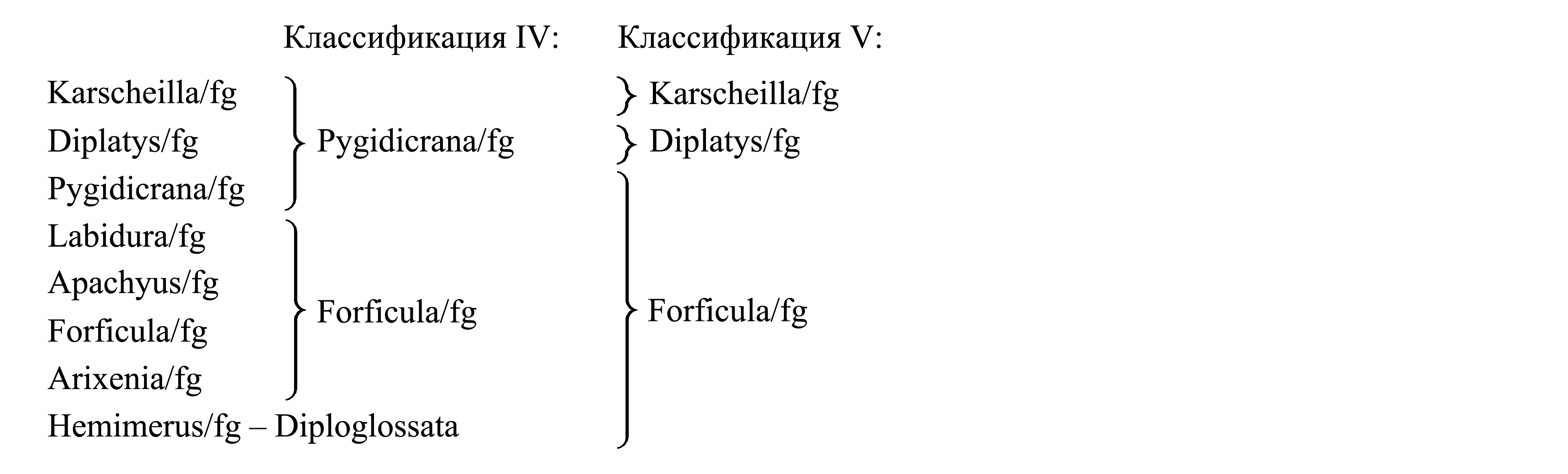 IV. Деление Neodermaptera на Pygidicrana/fg и Forficula/fg
