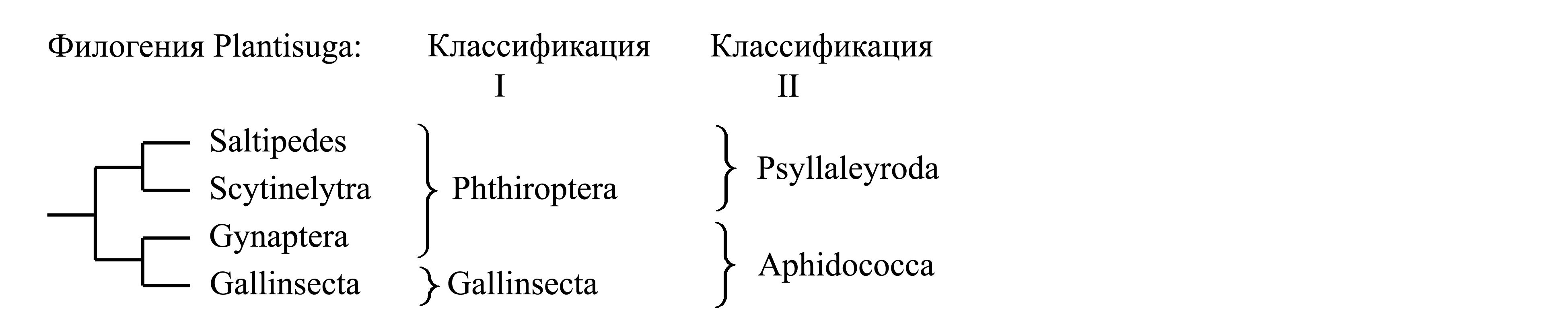 Классификации Plantisuga. В составе Plantisuga имеются 4 четко очерченные голофилетические группы – тли (Gynaptera, или Aphis/fg), кокциды (Gallinsecta, или Coccus/fg), листоблошки (Saltipedes, или Psylla/fg) и белокрылки (Scytinelytra, или Aleyrodes/fg). Предлагались следующие варианты объединения этих таксонов в более крупные группы.