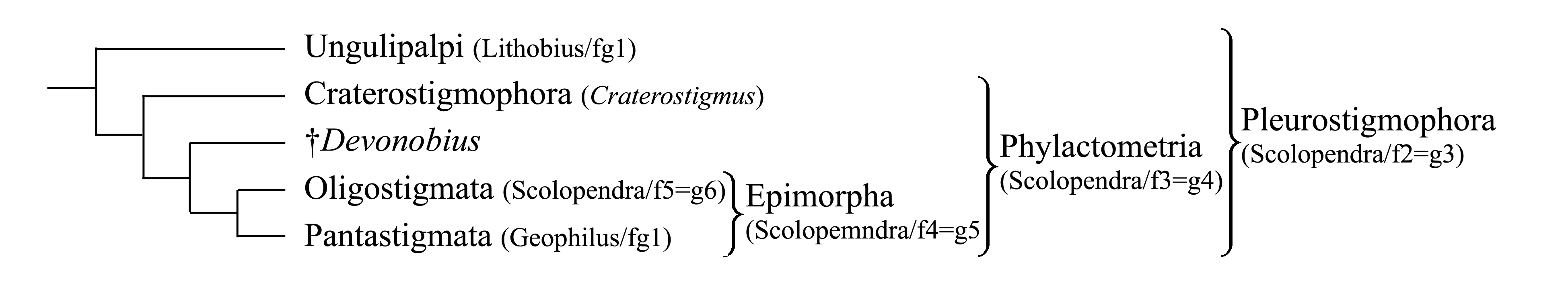 2.2. †Devonobius/fg [fg:1988]; часто используемое типифицированное название – Devonobiomorpha}. Аутапоморфия: коксы ногочелюстей [см. Chilopoda (4)] на проксимальном (заднем) крае с парой длинных направленных назад отростков. Туловище имеет более 16 сегментов, несущих ноги [вместо исходных пятнадцати – см. Chilopoda (5)] (точное число туловищных сегментов неизвестно); возможно, увеличенное число сегментов – синапоморфия с Epimorpha. В отличие от Epimorpha, между коксами ногочелюстей сохраняется продольный шов; укороченные 4-й и 5-й членики ногочелюсти цельные (как на рис. 5.5.2B). Вымерший таксон, известный только по одному виду Devonobius delta Shear & Bonamo 1988 из среднего девона США. Описан по экземплярам необычайно хорошей сохранности – это экзувии (линочные шкурки), сохраняющиеся после растворения камня в кислоте.