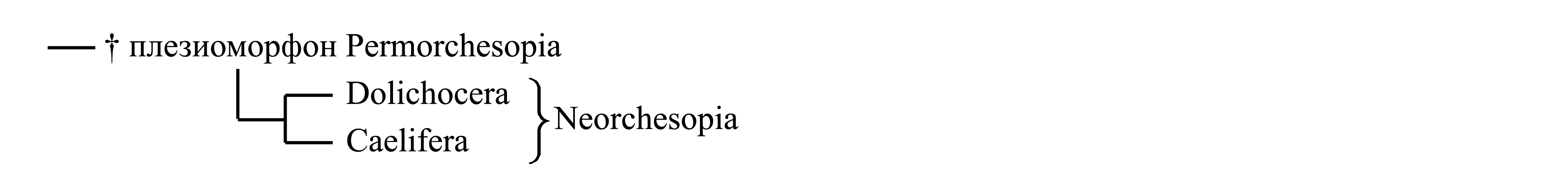 Классификация Saltatoria. Принято делить всех Saltatoria на два подчиненных таксона – Dolichocera (= « Ensifera» auct.) и Caelifera; при этом вымершая группа Oedischia/fg помещается в таксон Dolichocera s.l. По другой классификации вымерший плезиоморфон Permorchesopia (или Oedischia/fg1) противопоставляется всем прочим сальтаториям, объединяемым в таксон Neorchesopia, который, в свою очередь, делится на Dolichocera s.str. и Caelifera.