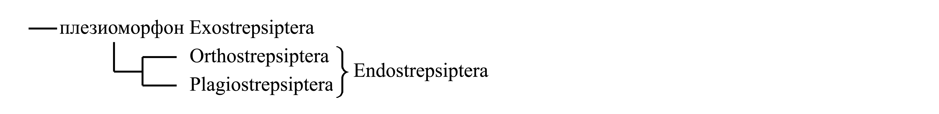 2.1. Orthostrepsiptera taxon nov. {nom.hier.: Corioxenos/f1=Triozocera/g1 [f:1970; g:1909]; типифицированное название: Corioxeniformia: Kinzelbach 1971}. Характеризуется преимущественно плезиоморфиями, в частности пупарий самки располагается так, что вентральная сторона головогруди прижата к поверхности тела хозяина (рис. 10.3.3D); у самца эдеагус без резкого изгиба (то же у Exostrepsiptera). Апоморфией этого таксона является утрата мандибул у самца имаго. Паразитируют только на Hemelytrata.