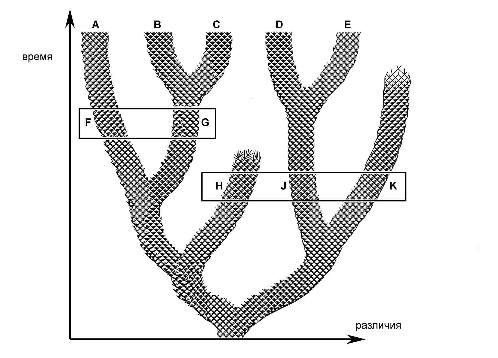 Рис. 1.1. Филогения абстрактной группы живых организмов. Соединяющиеся и разветвляющиеся линии символизируют спаривание и размножение особей. Рамками выделены временны'е срезы, поддающиеся изучению. Буквами A, B, C, D и E обозначены современные виды; буквами F, G, H, J и K обозначены известные ископаемые виды.
