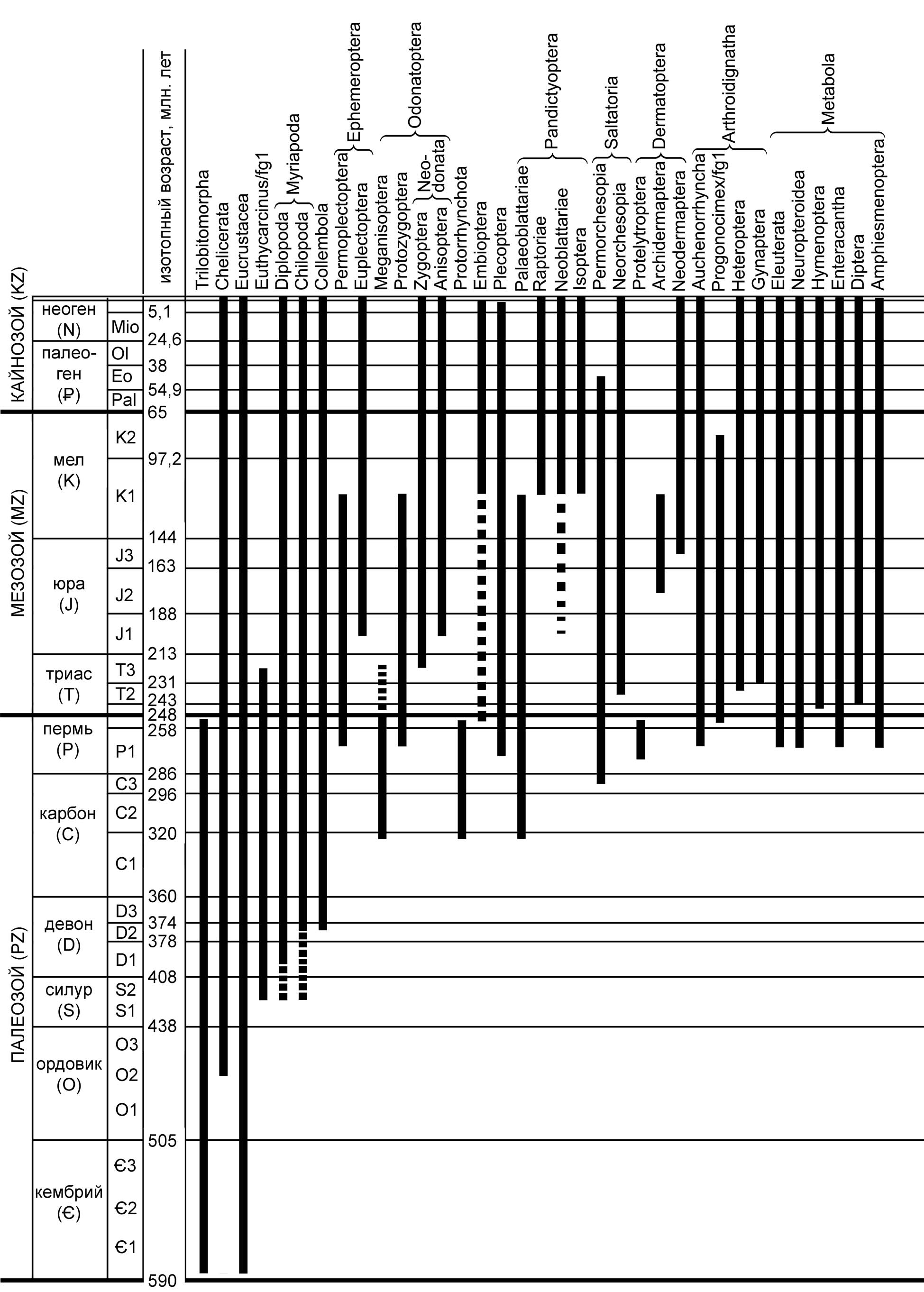 Рис. 2.2. Геологический возраст некоторых таксонов членистоногих. Сплошной черной полосой показан разброс по времени окаменелостей, достоверно относящихся к данному таксону; прерывистой черной полосой – окаменелостей, предположительно относимых к данному таксону. Изотопный возраст указан по Харленд и др. 1985. Сокращения: Mio – миоцен, Ol – олигоцен, Eo – эоцен, Pal – палеоцен.