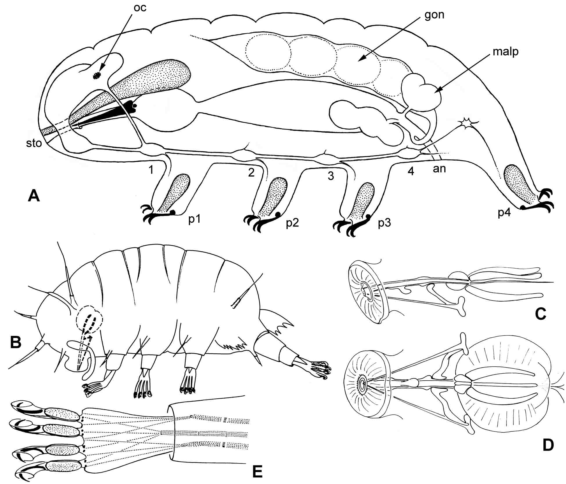 Ðèñ. 4.3. Tardigrada. A – Eutardigrada: Macrobiotus sp., (ñõåìà íà îñíîâå Dewel, Nelson & Dewel 1993; Walz 1979; Ramazotti 1962). B–E – Prototardigrada: Paradoxious orzeliscoides Kristensen & Higgins 1989 (ïî Kristensen & Higgins 1989, ñõåìàòèçèðîâàíî): B – îáùèé âèä; C–D – êóòèêóëÿðíûé ñêåëåò ðîòîâîãî àïïàðàòà, ëàòåðàëüíî è âåíòðàëüíî (íà ðèñ. D ïîêàçàí òàêæå ãëîòî÷íûé íàñîñ); E – íîãà, âåíòðàëüíî (òî÷å÷íûìè ëèíèÿìè ïîêàçàíû ìûøöû è èäóùèå îò íèõ íèòè, âòÿãèâàþùèå êîãîòêè). Óñëîâíûå îáîçíà÷åíèÿ: 1–4 – ãàíãëèè I–IV ñåãìåíòîâ òåëà; an – àíàëüíîå îòâåðñòèå; gon – ãîíàäà; malp – ìàëüïèãèåâû ñîñóäû; oc – ãëàç; p1–p4 – íîãè I–IV ïàð; sto – ðîòîâîå îòâåðñòèå.