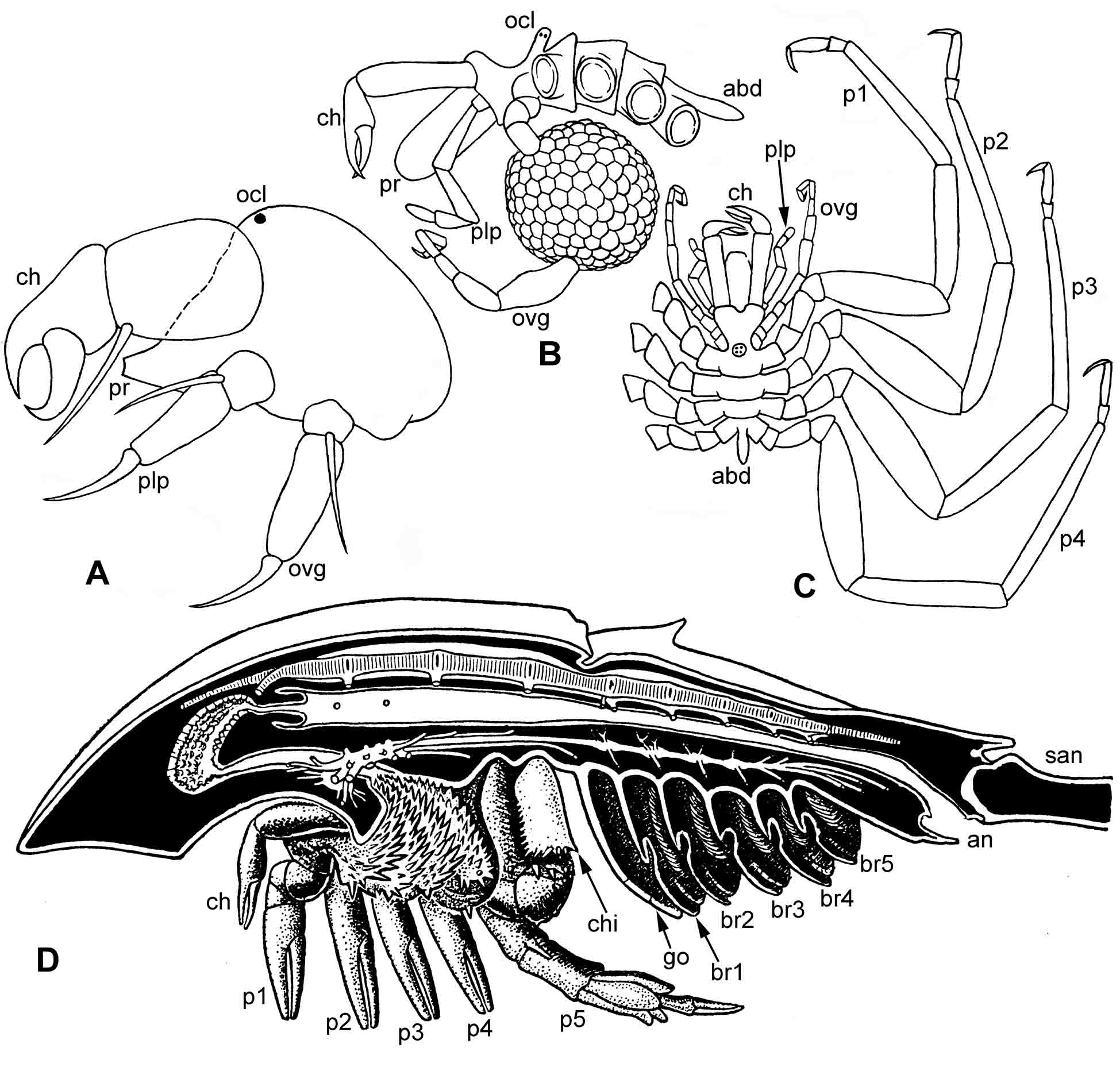 Ðèñ. 4.5. Chelicerophora. A–C – Pantopoda: A – ëè÷èíêà (ïðîòîíèìôîí) Ammothea echinata Hodge 1864, âèä ñëåâà (ñõåìà ïî ðèñóíêàì èç Meisenheimer 1902); B–C – Chaetonymphon hirtipes (Bell 1853) (ïî Sars 1891, ñ óïðîùåíèÿìè, ùåòèíêè íå ïîêàçàíû): B – âèä ñëåâà, íîãè óäàëåíû, íà îâèãåðå ÿéöà; Ñ – äîðñàëüíî, íîãè ëåâîé ñòîðîíû íå ïîêàçàíû. D – Chelicerata: Limulus polyphemus Linnaeus: ïðîäîëüíûé ñðåç (ïî Kaestner 1956: Abb. 520). Óñëîâíûå îáîçíà÷åíèÿ: abd – áðþøêî; br1–br5 – æàáðû; ch – õåëèöåðà; chi – õèëÿðèé; go – ãåíèòàëüíàÿ êðûøêà; ocl – ãëàçîê (íà ðèñ. A) è âûñòóï ñ äâóìÿ ïàðàìè ãëàçêîâ (íà ðèñ. B); ovg – îâèãåð; p1–p4 – õîäèëüíûå íîãè; plp – ïàëüïà; pr – õîáîò; san – ñóïðààíàëüíûé ïðèäàòîê.