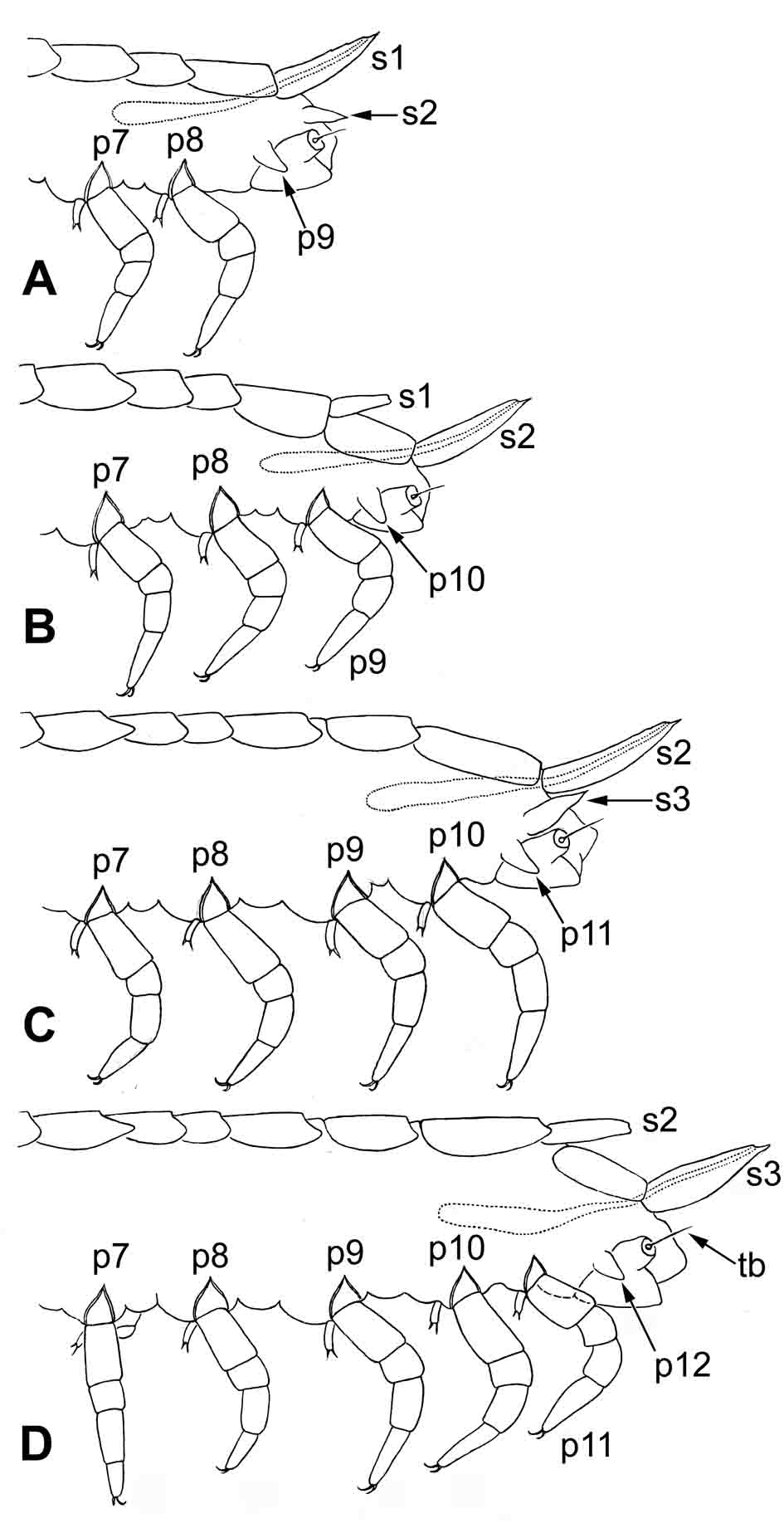 Ðèñ. 5.2.2. Symphyla: Scutigerella immaculata (Newport 1845 [Scolopendrella]): çàäíèé êîíåö òåëà ëè÷èíîê ïîñëåäóþùèõ âîçðàñòîâ: A – ñ 8 ïàðàìè íîã; B – ñ 9 ïàðàìè íîã; C – ñ 10 ïàðàìè íîã; D – ñ 11 ïàðàìè íîã. Óñëîâíûå îáîçíà÷åíèÿ: s1–s3 – ïîñëåäîâàòåëüíî îáðàçóþùèåñÿ ïðÿäèëüíûå ïðèäàòêè; p7–p12 – íîãè VII–XII ïàð è èõ çà÷àòêè; tb – òðèõîáîòðèÿ.