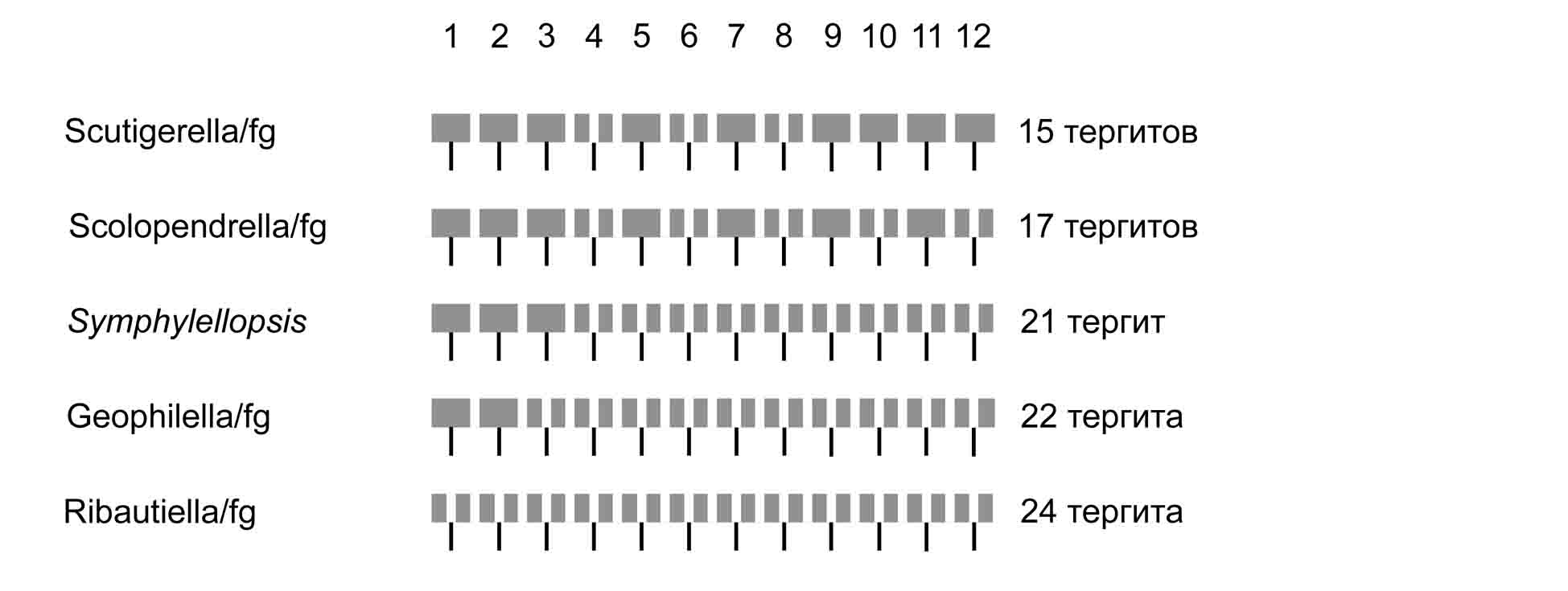 Рис. 5.2.3. Схема взаиморасположение тергитов туловища и пар ног у разных представителей Symphyla. Условные обозначения: ▓▓▓ или ▓ – тергит; │ – пара ног.