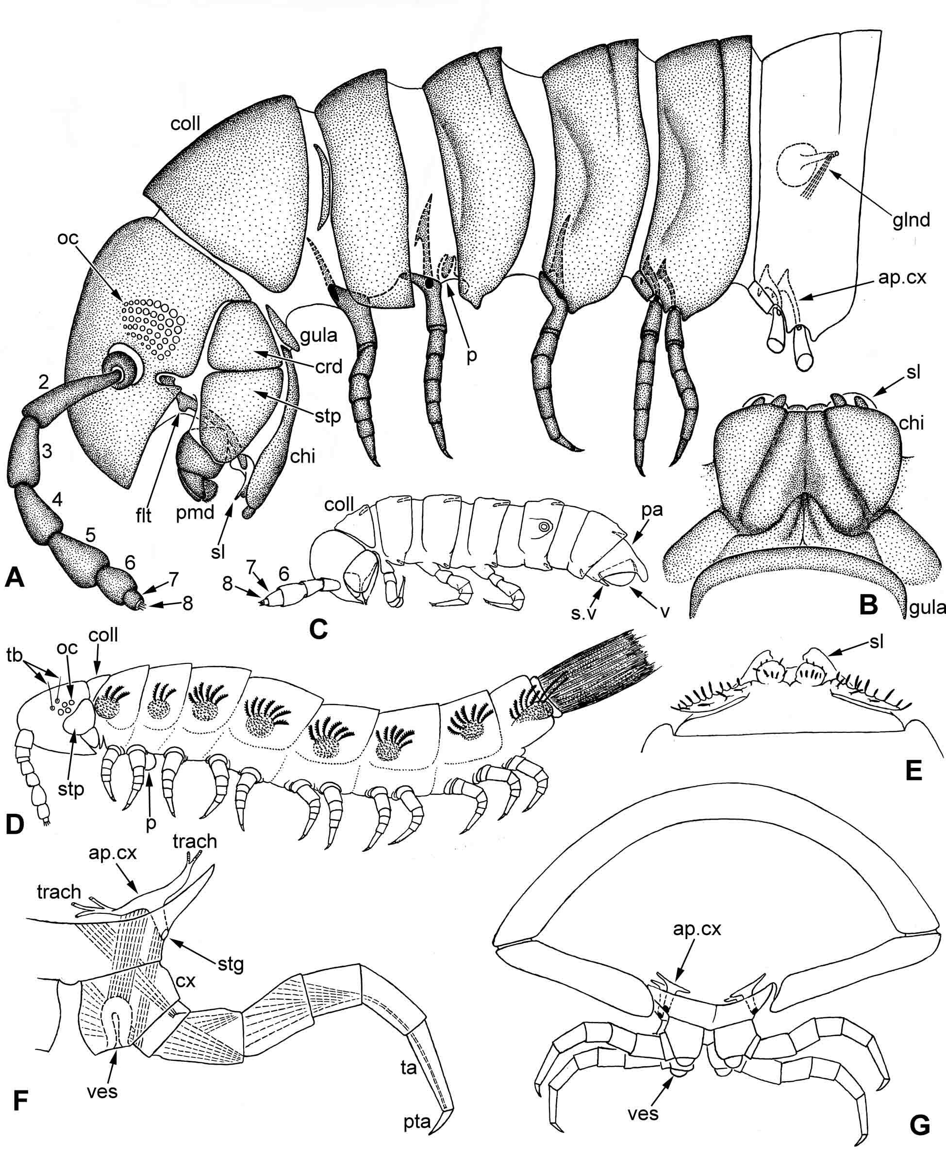 Ðèñ. 5.3. Diplopoda. A – Julus sp., íåïîëîâîçðåëûé ñàìåö, ïåðåäíÿÿ ÷àñòü òåëà, ñáîêó (ñõåìàòèçèðîâàíî, ñåãìåíòû è ðîòîâûå ïðèäàòêè íååñòåñòâåííî ðàçäâèíóòû; ïðåðûâèñòîé ëèíèåé ïîêàçàíà çàùèòíàÿ æåëåçà ñ çàìûêàòåëüíûì àïïàðàòîì è åãî ìûøöåé). B – Glomeris sp., õèëÿðèé, âåíòðàëüíî. C – Polydesmus sp., ëè÷èíêà ïåðâîãî âîçðàñòà. D–E – Penicillata: Polyxenus lagurus (Linnaeus 1758 [Scolopendra lagura]): D – îáùèé âèä ñáîêó (ãðåáåí÷àòûå ùåòèíêè íà ãîëîâå è áîëüøàÿ ÷àñòü ãðåáåí÷àòûõ ùåòèíîê íà òóëîâèùå íå ïîêàçàíû); E – õèëÿðèé. F–G – Colobognatha: Polyzonium germanicum Brandt 1831: F – ñòåðíèò è ëåâàÿ íîãà, âèä ñïåðåäè; G – äèïëîñåãìåíò áðþøêà, âèä ñïåðåäè. Óñëîâíûå îáîçíà÷åíèÿ: 1–8 – ÷ëåíèêè àíòåííû; ap.cx – êîêñàëüíàÿ àïîäåìà; chi – õèëÿðèé; coll – êîëëþì; crd – êàðäî ìàíäèáóëû; cx – êîêñà (òàçèê); flt – ôóëüòóðà; glnd – çàùèòíàÿ æåëåçà; oc – àãðåãèðîâàííûé ãëàç; p – ïåíèñ; pa – ïðåàíàëüíîå êîëüöî òåëüñîíà; pmd – ïðåìàíäèáóëà; pta – ïðåòàðñóñ (êîãîòîê); sl – ïðåäïîëàãàåìàÿ ñóïåðëèíãâà; stg – îòâåðñòèå êîêñàëüíîé àïîäåìû, ñëóæàùåå äûõàëüöåì; stp – ñòèïåñ ìàíäèáóëû; s.v – âåíòðàëüíàÿ ÷åøóéêà òåëüñîíà; ta – òàðñóñ (ëàïêà); tb – òðèõîáîòðèÿ; trach – òðàõåÿ; v – âàëüâà òåëüñîíà; ves – âòÿæíîé ïóçûðåê (ìàòåðèàë: ñ. 000).