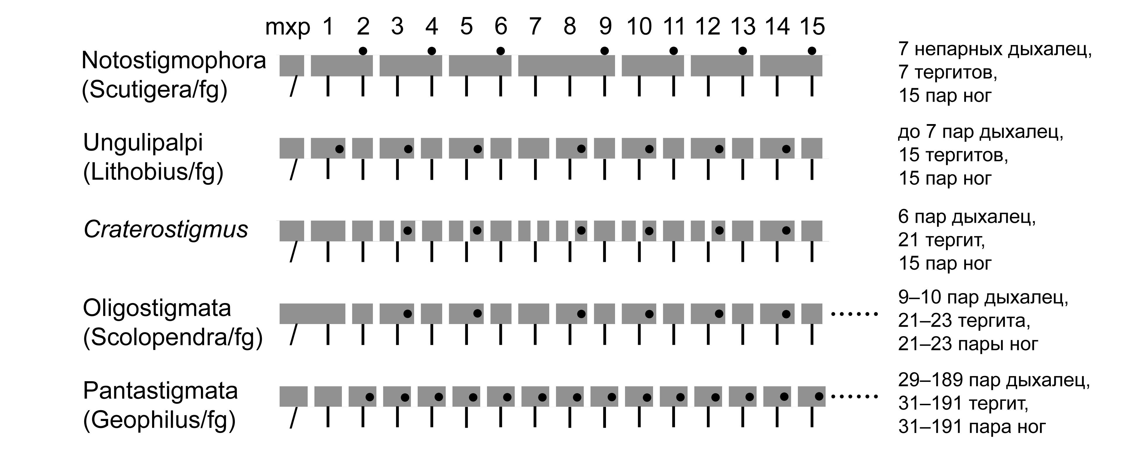 Ðèñ. 5.5.4. Ñõåìà âçàèìîðàñïîëîæåíèå òåðãèòîâ òóëîâèùà è ïàð íîã ó ðàçíûõ ïðåäñòàâèòåëåé Chilopoda. Óñëîâíûå îáîçíà÷åíèÿ: ▓▓▓ èëè ▓ – òåðãèò; I – ïàðà íîã; / – ïàðà ÿäîâèòûõ êðþ÷üåâ; ● – íåïàðíîå äûõàëüöå èëè ïàðà äûõàëåö; 1–15 – íîìåðà ñåãìåíòîâ, íåñóùèõ õîäèëüíûå íîãè (íà÷èíàÿ ñ VI ïîñòîðàëüíîãî ñåãìåíòà è äàëåå); mxp – ñåãìåíò, íåñóùèé ÿäîâèòûå êðþ÷üÿ (V ïîñòîðàëüíûé ñåãìåíò). Notostigmophora – ñì. ðèñ. 5.5.1A; Ungulipalpi – ñì. 5.5.3.