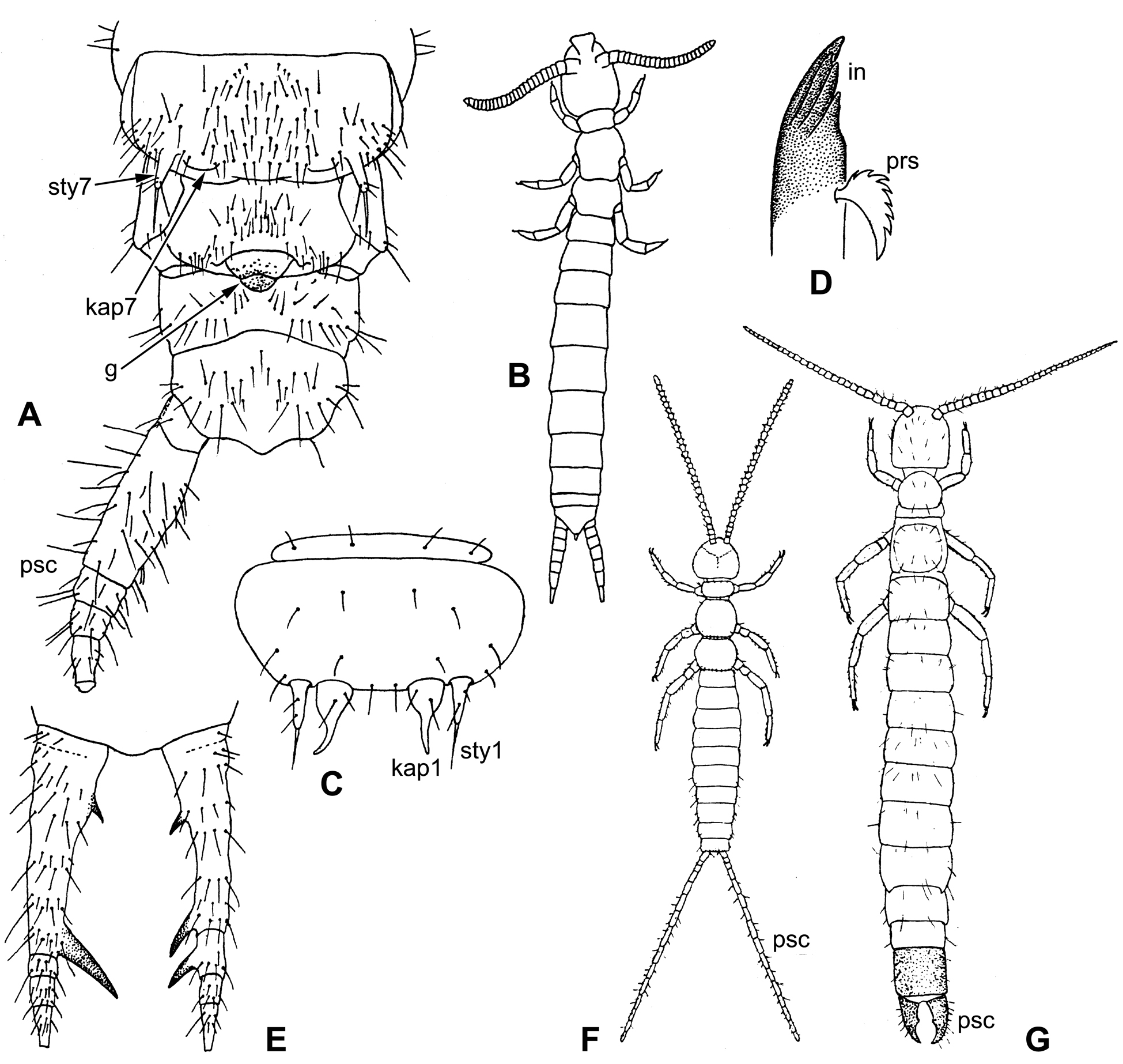 Ðèñ. 6.3.3. Diplura. A – Octostigma herbivora Rusek 1982, âåðøèíà áðþøêà ñàìöà, âåíòðàëüíî (ïî Rusek 1982, ñ óïðîùåíèÿìè). B – Anajapyx vesiculosus Silvestri 1903 (ïî Silvestri 1903). C–D – Anajapyx menkei Smith 1960 (ïî Smith 1960): C – I ñòåðíèò áðþøêà; D – âåðøèíà ëåâîé ìàíäèáóëû, äîðñàëüíî; E – Symphylurinus almeidai Wygodzinsky 1946, ïñåâäîêàóäàëèè (ïî Smith 1960); F – Campodea plusiochaeta Silvestri 1912, äîðñàëüíî (ïî Stach 1955); G – Catajapyx confusus (Silvestri 1929 [Iapyx]), äîðñàëüíî (ïî Stach 1955). Óñëîâíûå îáîçíà÷åíèÿ: g – ãåíèòàëüíàÿ ïàïèëëà; in – èíöèçîð ìàíäèáóëû; kap1 – êèíåòàïîôèç I ïàðû; kap7 – êèíåòàïîôèç (âòÿæíîé ïóçûðåê) VII ïàðû; prs – ïðîñòåêà; psc – ïñåâäîêàóäàëèÿ; sty1, ste7 – ñòåðíîñòèëü I è VII ïàð.