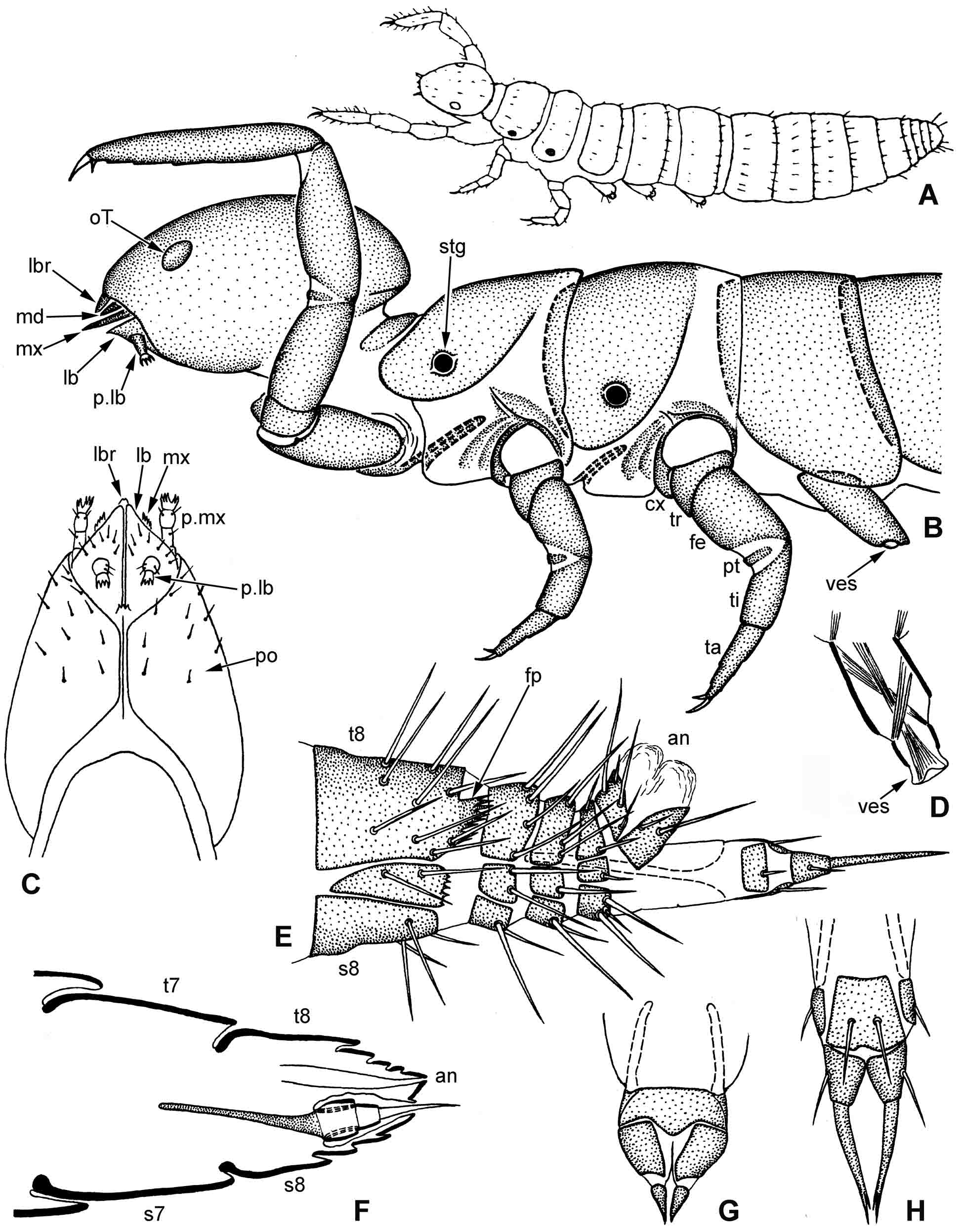 Ðèñ. 6.5. Protura. A – îáùèé âèä; B – ïåðåäíÿÿ ÷àñòü òåëà, ñáîêó; C – ãîëîâà âåíòðàëüíî; D – êîíå÷íîñòü I ñåãìåíòà áðþøêà â ðàçðåçå, ïîêàçàíû ìûøöû; E – âåðøèíà áðþøêà ñàìöà ñáîêó, ãåíèòàëèè âûâåðíóòû; F – ïðîäîëüíûé ðàçðåç âåðøèíû áðþøêà ñàìöà ñ ââåðíóòûìè ãåíèòàëèÿìè. G – ãåíèòàëèè ñàìêè âåíòðàëüíî (íà ðèñ. G è H ïðåðûâèñòîé ëèíèåé ïîêàçàíû ëåæàùèå âíóòðè ñêëåðîòèçîâàííûå àïîäåìû); H – ãåíèòàëèè ñàìöà âåíòðàëüíî. A – Eosentomon armatum Stach 1926 (ïî Stach 1955); B – Eosentomon sp.; C – Eosentomon transitorium Berlese 1909 (ïî Francois 1969, ñ óïðîùåíèÿìè); D–E – Acerentomon doderei Silvestri 1907 (ïî Berlese 1909, ñ óïðîùåíèÿìè). Óñëîâíûå îáîçíà÷åíèÿ: an – àíàëüíîå îòâåðñòèå; cx – òàçèê; fe – áåäðî; f.p – çóá÷àòàÿ êðûøå÷êà, ïðèêðûâàþùàÿ îòâåðñòèå àáäîìèíàëüíîé æåëåçû; lb – íèæíÿÿ ãóáà; lbr – âåðõíÿÿ ãóáà; md – ìàíäèáóëà; mx – ìàêñèëëà; oT – ëîæíûé ãëàçîê (îðãàí Òåìåøâàðè); p.lb – ëàáèàëüíûé ùóïèê; p.mx – ìàêñèëëÿðíûé ùóïèê; po – îðàëüíàÿ ñêëàäêà; pt – ïàòåëëà; s7, s8 – VII è VIII ñòåðíèòû áðþøêà; stg – ñòèãìà (äûõàëüöå); t7, t8 – VII è VIII òåðãèòû áðþøêà; ta – ëàïêà; ti – ãîëåíü; tr – âåðòëóã; ves – âòÿæíîé ïóçûðåê.