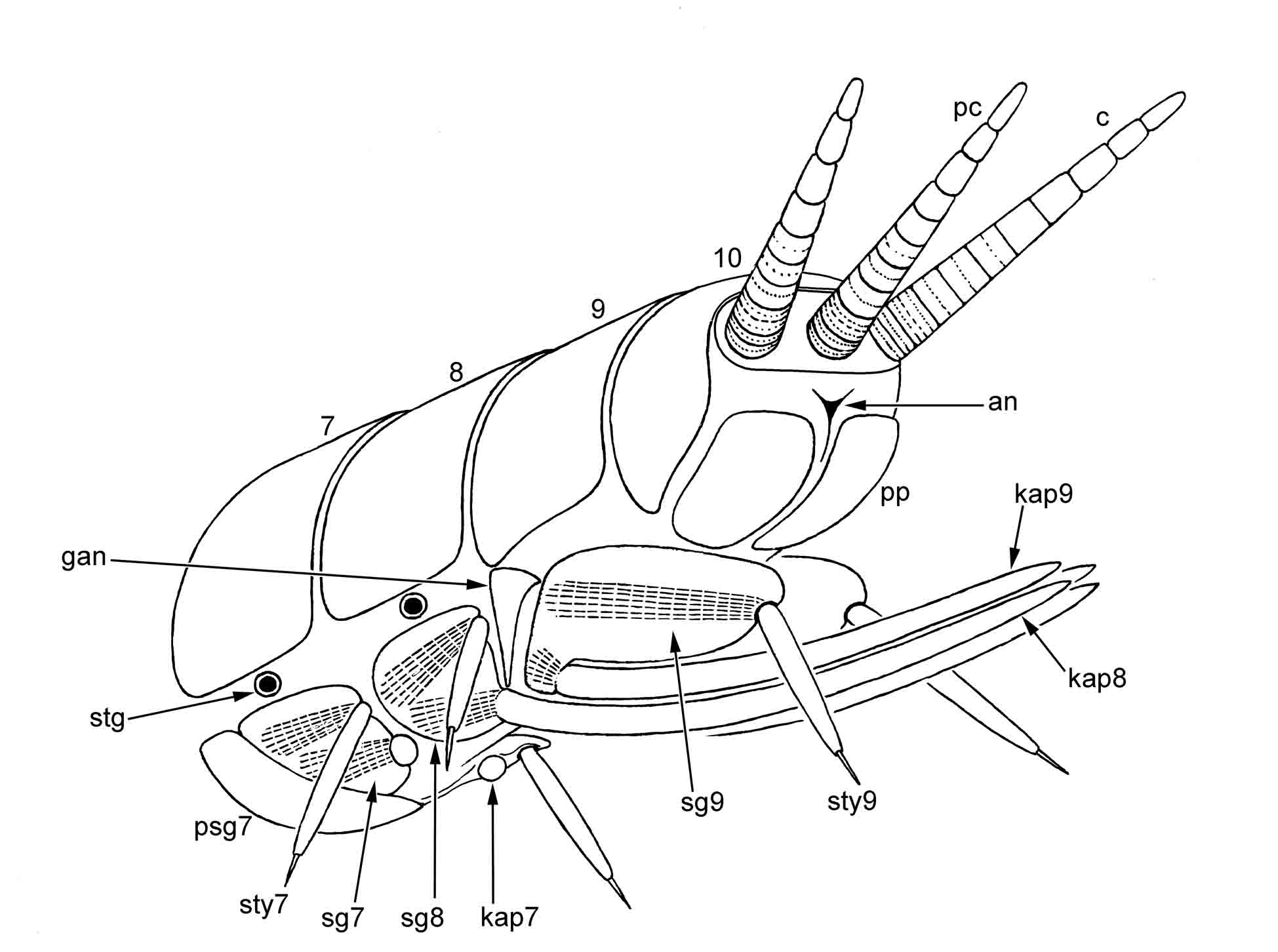 Ðèñ. 6.6.3. Ñõåìà ñòðîåíèÿ VII–X ñåãìåíòîâ áðþøêà ñàìêè ó Amyocerata; â îñíîâíîì ñîîòâåòñòâóåò ñòðîåíèþ Zygentoma, çà èñêëþ÷åíèåì òîãî, ÷òî ïðîïîðöèè èçìåíåíû, à òåðãèòû è óíèñòèëèãåðû íå íàëåãàþò äðóã íà äðóãà. Ïðåðûâèñòîé ëèíèåé ïîêàçàíû ìûøöû ñòåðíîñòèëåé è êèíåòàïîôèçîâ ëåâîé ñòîðîíû. Óñëîâíûå îáîçíà÷åíèÿ: 7–10 – òåðãèòû VII–X ñåãìåíòîâ áðþøêà; an – àíàëüíîå îòâåðñòèå; c – öåðê; gan – ãîíàíãóë; kap7 – êèíåòàïîôèç VII ïàðû (âòÿæíîé ïóçûðåê); kap8, kap9 – êèíåòàïîôèçû VIII è IX ïàð (ñòâîðêè ÿéöåêëàäà); pc – ïàðàöåðê; pp – ïàðàïðîêò; psg7 – ïðåñòèëèãåð VII ñåãìåíòà áðþøêà; sg7–sg9 – ñòèëèãåðû VII–IX ñåãìåíòîâ áðþøêà; stg – ñòèãìà (äûõàëüöå); sty – ñòåðíîñòèëü.