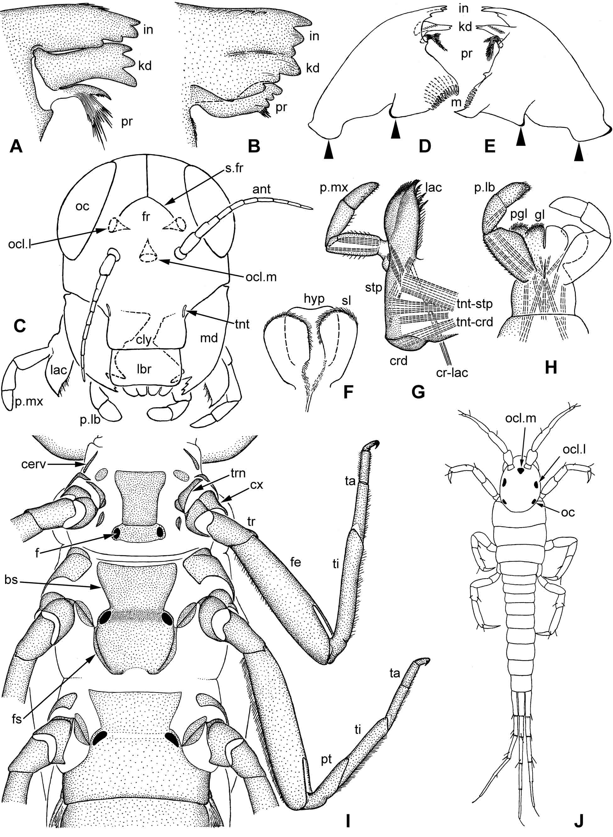 Ðèñ. 7.2.3. Ephemeroptera: äåòàëè ñòðîåíèÿ ëè÷èíîê. A – âåðøèíà ìàíäèáóëû Siphlaenigma janae Penniket 1962; B – âåðøèíà ìàíäèáóëû Afroptilum sudafricanum (Lestage 1924 [Centroptilum]). C–H – ãîëîâà è ðîòîâûå ïðèäàòêè ëè÷èíêè Siphlonurus aestivalis (ñì. ðèñ. 7.2.1B): C – ãîëîâà ñïåðåäè; D–E – ëåâàÿ è ïðàâàÿ ìàíäèáóëû (òðåóãîëüíèêàìè ïîêàçàíû òî÷êè îïîðû); F – ãèïîôàðèíêñ è ñóïåðëèíãâû; G – ìàêñèëëà; H – íèæíÿÿ ãóáà. I – Chiloporter penai Demoulin 1955, ãðóäü ëè÷èíêè, âåíòðàëüíî; J – Siphlonurus lacustris Eaton 1870, ëè÷èíêà ïåðâîãî âîçðàñòà (ïî Degrange 1960). Óñëîâíûå îáîçíà÷åíèÿ: ant – àíòåííà; bs – áàçèñòåðíóì ñðåäíåãðóäè; cerv – öåðâèêàëüíûé ñêëåðèò; cly – íàëè÷íèê; cx – òàçèê; crd – êàðäî; cr-lac – ìûøöà îò êðàíèóìà ê ëàöèíèè; f – îòâåðñòèå ñòåðíàëüíîé àïîäåìû (ôóðêè); fe – áåäðî; fr – ëîá; fs – ôóðêàñòåðíóì ñðåäíåãðóäè; gl – ãëîññà; hyp – ãèïîôàðèíêñ; in – èíöèçîð; kd – êèíåòîäîíò; lac – ëàöèíèÿ ìàêñèëëû; lbr – âåðõíÿÿ ãóáà; m – ìîëà; md – ìàíäèáóëà; oc – çà÷àòîê ôàñåòî÷íîãî ãëàçà; ocl.l – ëàòåðàëüíûé ïðîñòîé ãëàçîê; ocl.m – ìåäèàëüíûé ïðîñòîé ãëàçîê; pgl – ïàðàãëîññà; p.lb – ëàáèàëüíûé ùóïèê; p.mx – ìàêñèëëÿðíûé ùóïèê; prs – ïðîñòåêà; pt – ïàòåëëà; s.fr – ëîáíûé øîâ; sl – ñóïåðëèíãâà; stp – ñòèïåñ; ta – ëàïêà; ti – ãîëåíü; tnt – ïåðåäíÿÿ òåíòîðèàëüíàÿ ÿìêà; tnt-crd – ìûøöà îò òåíòîðèóìà ê êàðäî tnt-stp – ìûøöà îò òåíòîðèóìà ê ñòèïåñó; tr – âåðòëóã; trn – òðîõàíòèí.