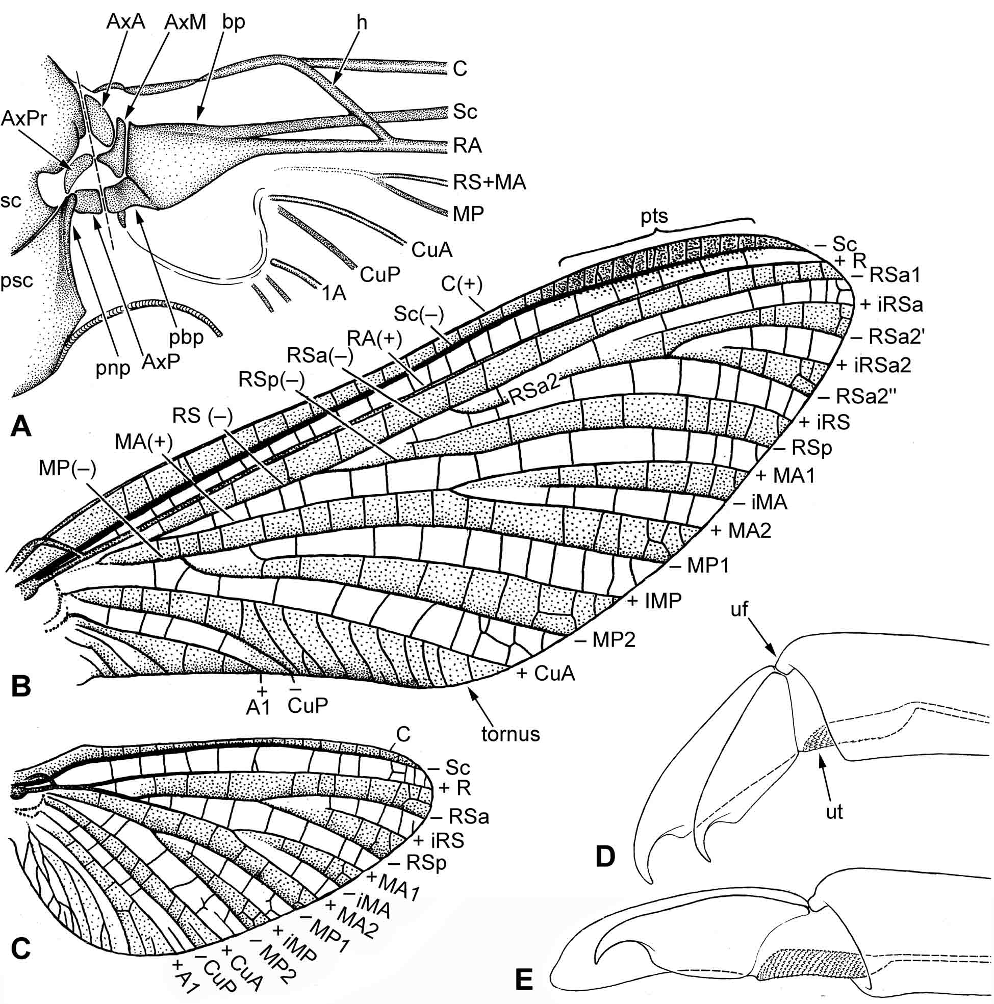 Ðèñ. 7.2.4. Ephemeroptera. A–C – èìàãî Siphlonurus aestivalis (Eaton 1903) (ñì. ðèñ. 7.2.2B): A – îñíîâàíèå ïåðåäíåãî êðûëà; B–C – ïåðåäíåå è çàäíåå êðûëüÿ. D – Âåðøèíà ëàïêè è êîãîòêè èìàãî Rhithrogena (Himalogena) pamirica Kluge 2015, âèä ñçàäè; E – òî æå, Rhithrogena (Himalogena) tianshanica Brodsky 1930 (êîãîòêè ýôåìåðîïòåðîèäíîãî òèïà). Óñëîâíûå îáîçíà÷åíèÿ: «+» – âûïóêëàÿ æèëêà; «–» – âîãíóòàÿ æèëêà; AxA – ïåðåäíèé àêñèëëÿðíûé ñêëåðèò; AxM – ñðåäíèé àêñèëëÿðíûé ñêëåðèò; AxP – çàäíèé àêñèëëÿðíûé ñêëåðèò; AxPr – ïðîêñèìàëüíûé àêñèëëÿðíûé ñêëåðèò; bp – áàçàëüíàÿ ïëàñòèíêà êðûëà; h – êîñòàëüíàÿ ñêîáà; pbp – çàäíèé âûñòóï áàçàëüíîé ïëàñòèíêè; pnp – çàäíèé êðûëîâîé âûñòóï; psc – ïàðàñêóòåëëóì; sc – ñêóòóì; uf – óíãóèôåð; ut – óíãóèòðàêòîð.