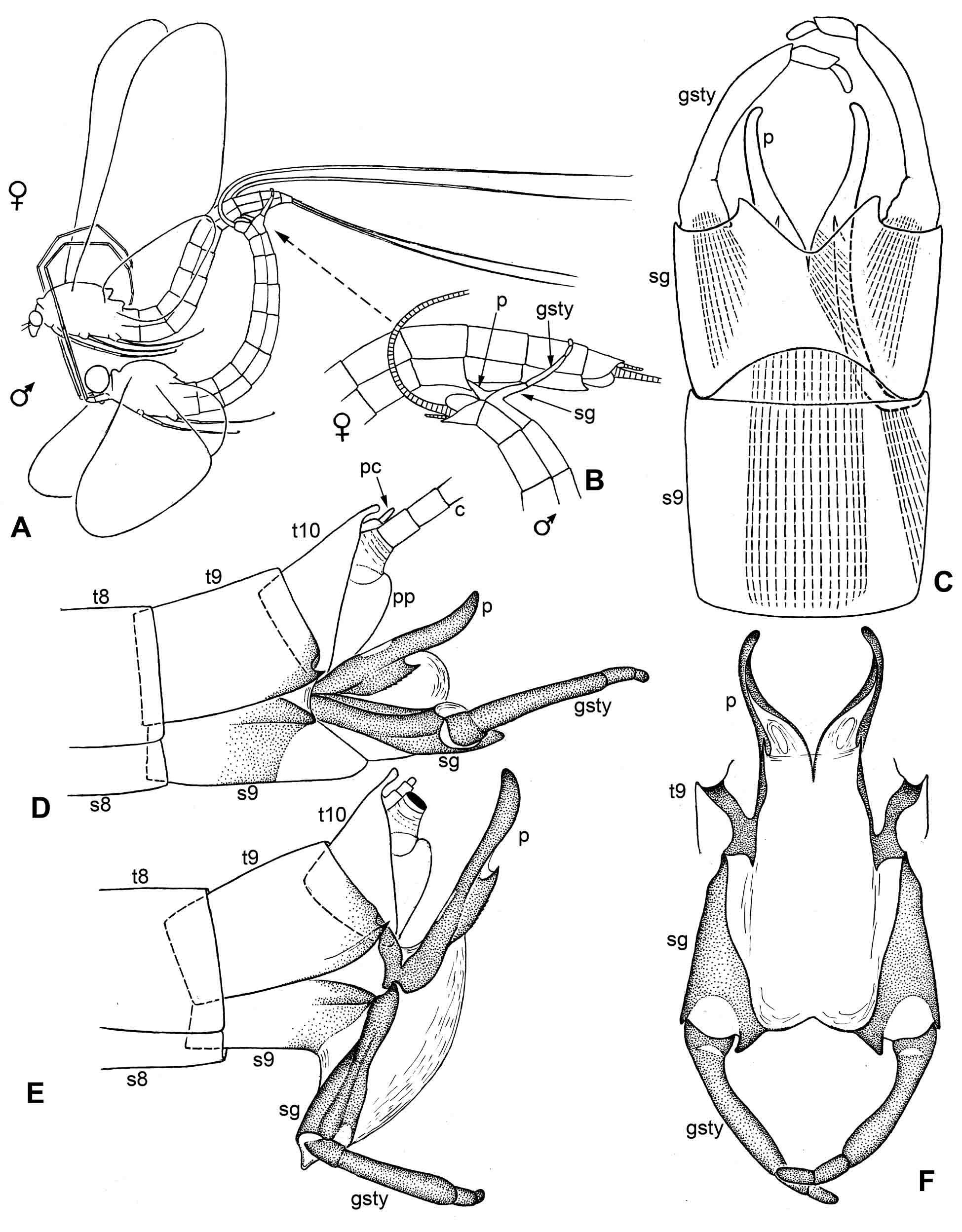 Рис. 7.2.6. Ephemeroptera: копулятивный аппарат самца. A–B – Parameletus chelifer Bengtsson 1908 (по Brinck 1957, с изменениями): A – копуляция; B – положение гениталий во время копуляции. C–F – Ameletus camtshaticus Ulmer 1927, гениталии самца имаго: С – вентрально (показаны мышцы бистилигера и гоностилей; справа прерывистой линией показаны скрытая часть пениса и мышцы пениса); D – латерально, в неактивном состоянии; E – латерально, в активном состоянии; F –сзади, в активном состоянии. Условные обозначения: c – церк; gsty – гоностиль; p – пенис; pc – парацерк; pp – парапрокт; s8–s9 – стерниты брюшка; sg – стилигер; t8–t10 – тергиты брюшка.
