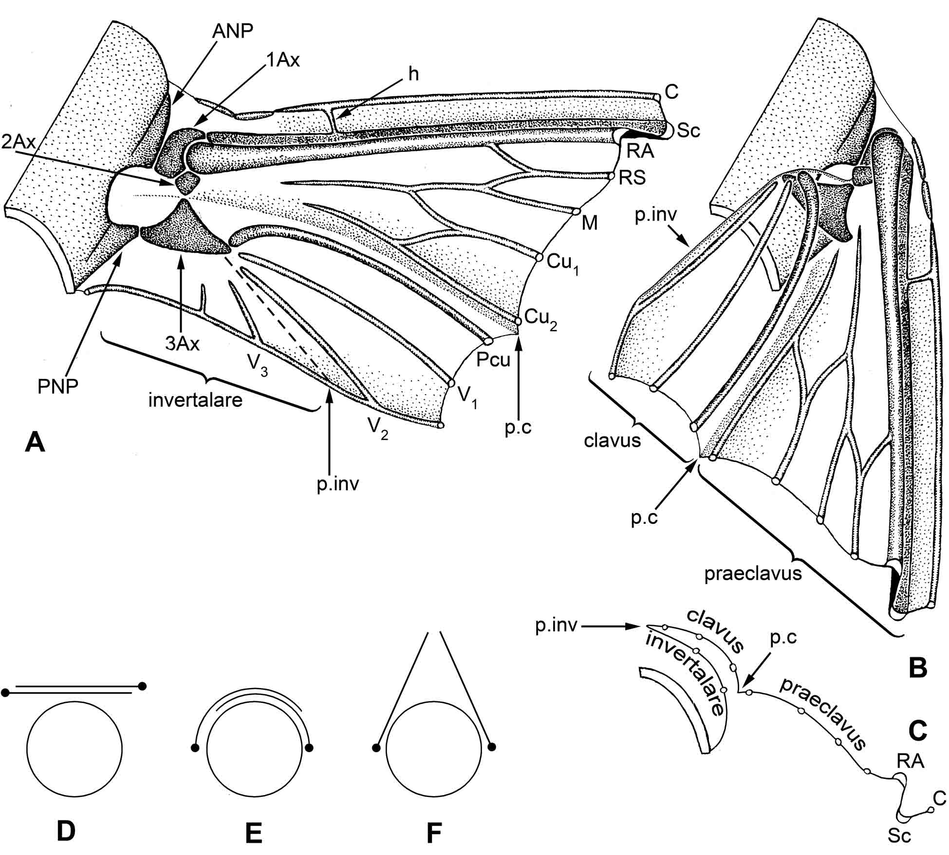 Ðèñ. 8.1. Neoptera: ñõåìà ñêëàäûâàíèÿ êðûëüåâ. A – ôðàãìåíò íîòóìà è îñíîâàíèå êðûëà (âèä äîðñàëüíî-ëàòåðàëüíî-ñçàäè); B – òî æå, â ñëîæåííîì ïîëîæåíèè; C – ïîïåðå÷íûé ñðåç ôðàãìåíòà íîòóìà è ïðîêñèìàëüíîé ÷àñòè êðûëà â ñëîæåííîì ïîëîæåíèè. D–F – ñïîñîáû ñêëàäûâàíèÿ êðûëüåâ (ïîïåðå÷íûå ñðåçû, êîñòàëüíûé êðàé êðûëà ïîêàçàí ÷åðíûì êðóæêîì): D – ïëîñêîå; E – îáëåãàþùåå; F – êðîâëåîáðàçíîå. Óñëîâíûå îáîçíà÷åíèÿ: 1Ax, 2Ax, 3Ax – ïåðâûé, âòîðîé è òðåòèé àêñèëëÿðíûå ñêëåðèòû; ANP – ïåðåäíèé êðûëîâîé âûñòóï íîòóìà; h – ïëå÷åâàÿ æèëêà; p.c – êëàâàëüíàÿ áîðîçäà; p.inv – èíâåðòàëÿðíàÿ ñêëàäêà; PNP – çàäíèé êðûëîâîé âûñòóï íîòóìà.
