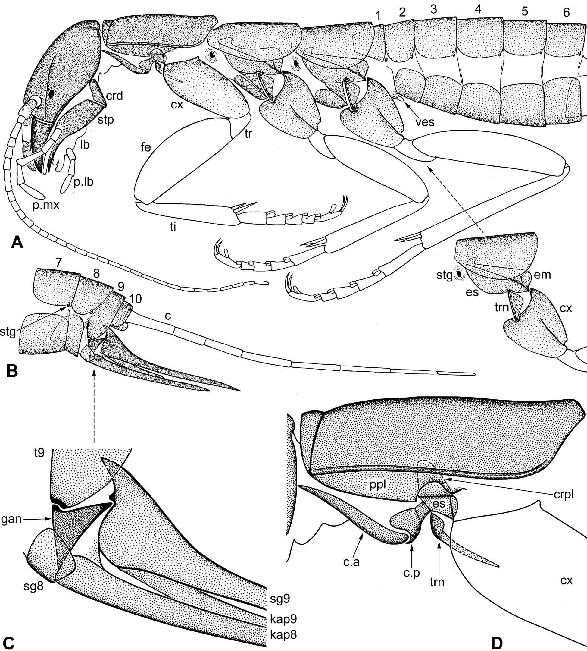 Ðèñ. 8.2.3. Notoptera: ñàìêà èìàãî Grylloblattina djakonovi Bey-Bienko 1951. A–B – îáùèé âèä, ëàòåðàëüíî; Ñ – îñíîâàíèå ÿéöåêëàäà, óâåëè÷åíî; D – ïåðåäíåãðóäü, óâåëè÷åíî (ïðåðûâèñòîé ëèíèåé ïîêàçàí êðèïòîïëåéðèò, ñêðûòûé òåðãèòîì). Óñëîâíûå îáîçíà÷åíèÿ: 1–10 – ñåãìåíòû áðþøêà; c – öåðê; ca – ïåðåäíèé öåðâèêàëüíûé ñêëåðèò; cp – çàäíèé öåðâèêàëüíûé ñêëåðèò; crd – êàðäî ìàêñèëëû; crpl – êðèïòîïëåéðèò; cx – òàçèê; em – ýïèìåðîí; es– ýïèñòåðíóì; fe – áåäðî; gan – ãîíàíãóë; kap8, kap9 – êèíåòàïîôèçû VIII è IX ïàð; lb – íèæíÿÿ ãóáà; p.lb – ëàáèàëüíûé ùóïèê; p.mx – ìàêñèëëÿðíûé ùóïèê; ppl – ëîæíîïëåéðèò; sg8, sg9 – ñòèëèãåðû VIII è IX ñåãìåíòîâ áðþøêà; stg – äûõàëüöå; stp – ñòèïåñ ìàêñèëëû; ti – ãîëåíü; tr – âåðòëóã; trn – òðîõàíòèí; ves – íåïàðíûé âòÿæíîé ïóçûðåê íà ïåðâîì ñòåðíèòå áðþøêà.