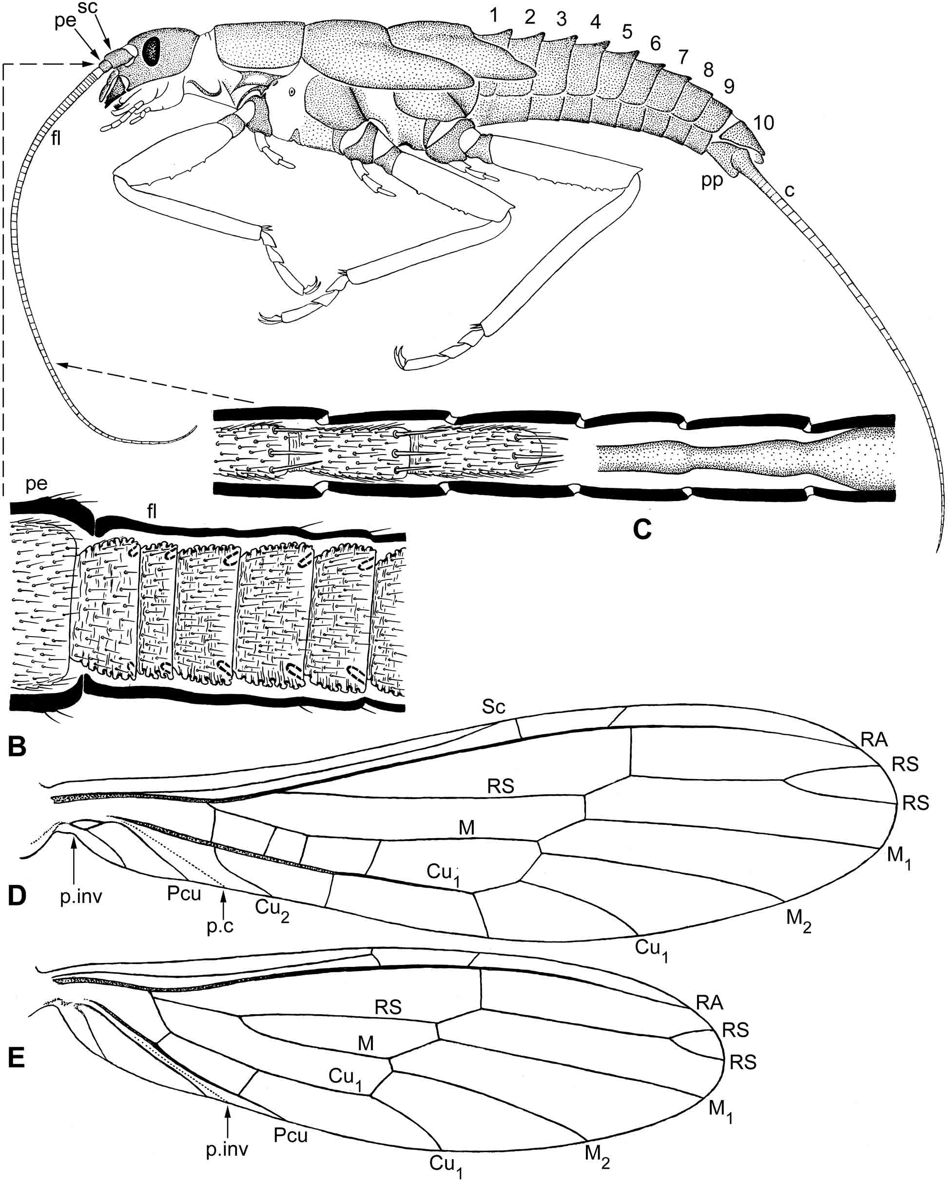 Ðèñ. 8.3.2. Plecoptera. A–C – Taeniopteryx nebulosa (Linnaeus 1758 [Phryganea]), ëè÷èíêà ïåðåä ëèíüêîé íà èìàãî: A – îáùèé âèä; B – ïðîäîëüíûé ðàçðåç âåðøèíû ïåäèöåëëóñà è îñíîâàíèÿ ôëàãåëëóìà; Ñ – ïðîäîëüíûé ðàçðåç â äèñòàëüíîé ÷àñòè ôëàãåëëóìà; D–E – ïåðåäíåå è çàäíåå êðûëî ñàìêè Chloroperla apicalis Newman 1836. Óñëîâíûå îáîçíà÷åíèÿ: 1–10 – ñåãìåíòû áðþøêà; ñ – öåðê; fl – ïåðâûé ÷ëåíèê ôëàãåëëóìà àíòåííû; p.c – êëàâàëüíàÿ áîðîçäà; pe – ïåäèöåëëóñ; p.inv – èíâåðòàëÿðíàÿ ñêëàäêà; pp – ïàðàïðîêò; sc – ñêàïóñ.