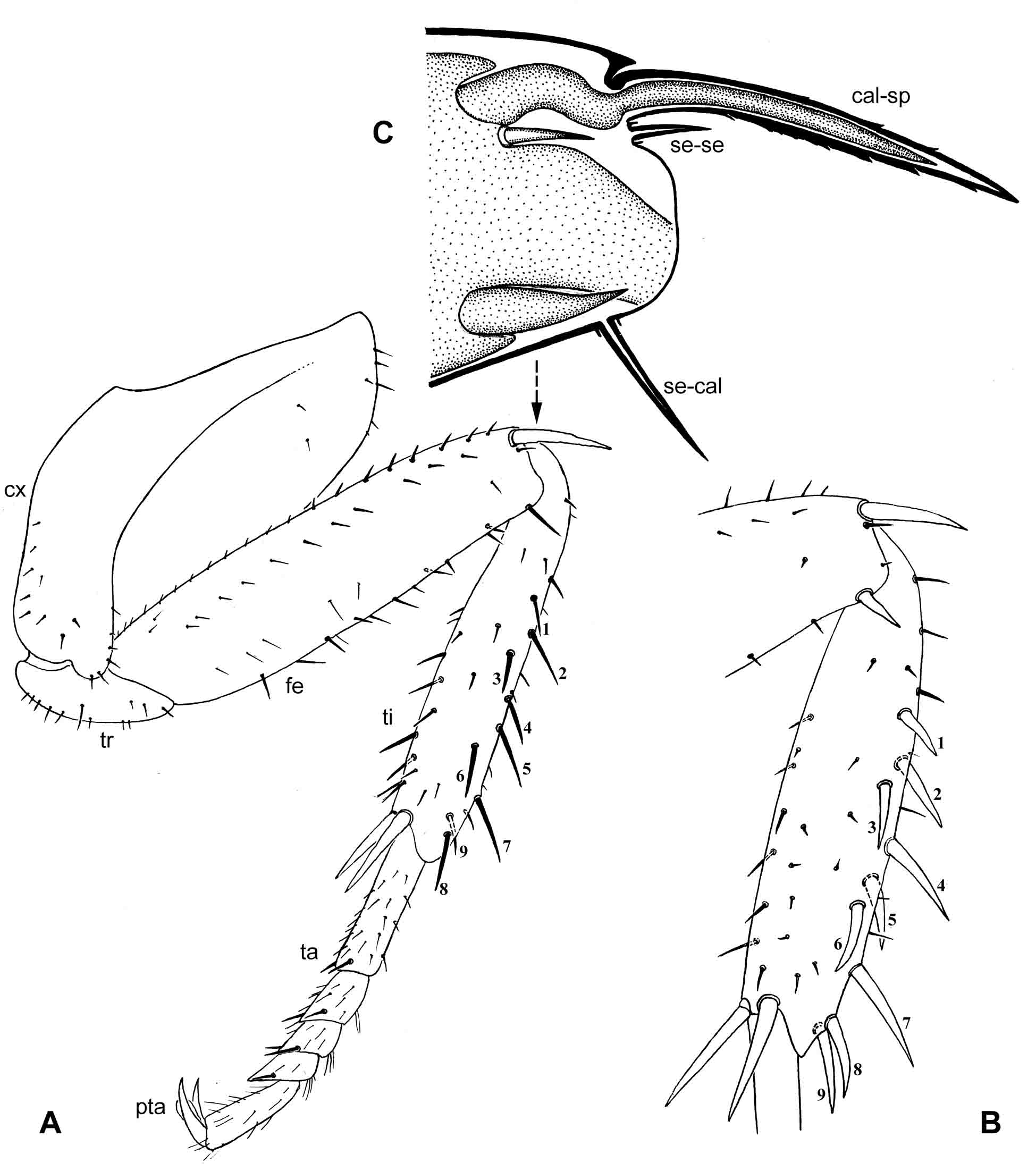 Ðèñ. 8.4.4. Pandictyoptera-Neoblattariae. Blattella germanica (Linnaeus 1767 [Blatta]). A – ñðåäíÿÿ íîãà, ýêçóâèé ëè÷èíêè 1-ãî âîçðàñòà; B – ãîëåíü ýòîé æå íîãè, ëè÷èíêà 2-ãî âîçðàñòà; C – îïòè÷åñêèé ñðåç êîëåíà ïåðåä ëèíüêîé ñ ïåðâîãî âîçðàñòà íà âòîðîé. Óñëîâíûå îáîçíà÷åíèÿ: 1–9 – ùåòèíêè ãîëåíè ó ëè÷èíêè ïåðâîãî âîçðàñòà è ñîîòâåòñòâóþùèå èì øïîðû ó ëè÷èíêè âòîðîãî âîçðàñòà; cal-cal – øïîðà, ïðåâðàùàþùàÿñÿ â øïîðó ñëåäóþùåãî âîçðàñòà; cx – òàçèê; fe – áåäðî; pta – ïðåòàðñóñ; se-cal – ùåòèíêà, ïðåâðàùàþùàÿñÿ â øïîðó ñëåäóþùåãî âîçðàñòà; se-cal – ùåòèíêà, ïðåâðàùàþùàÿñÿ â ùåòèíêó ñëåäóþùåãî âîçðàñòà; ta – ëàïêà; ti – ãîëåíü; tr – âåðòëóã.