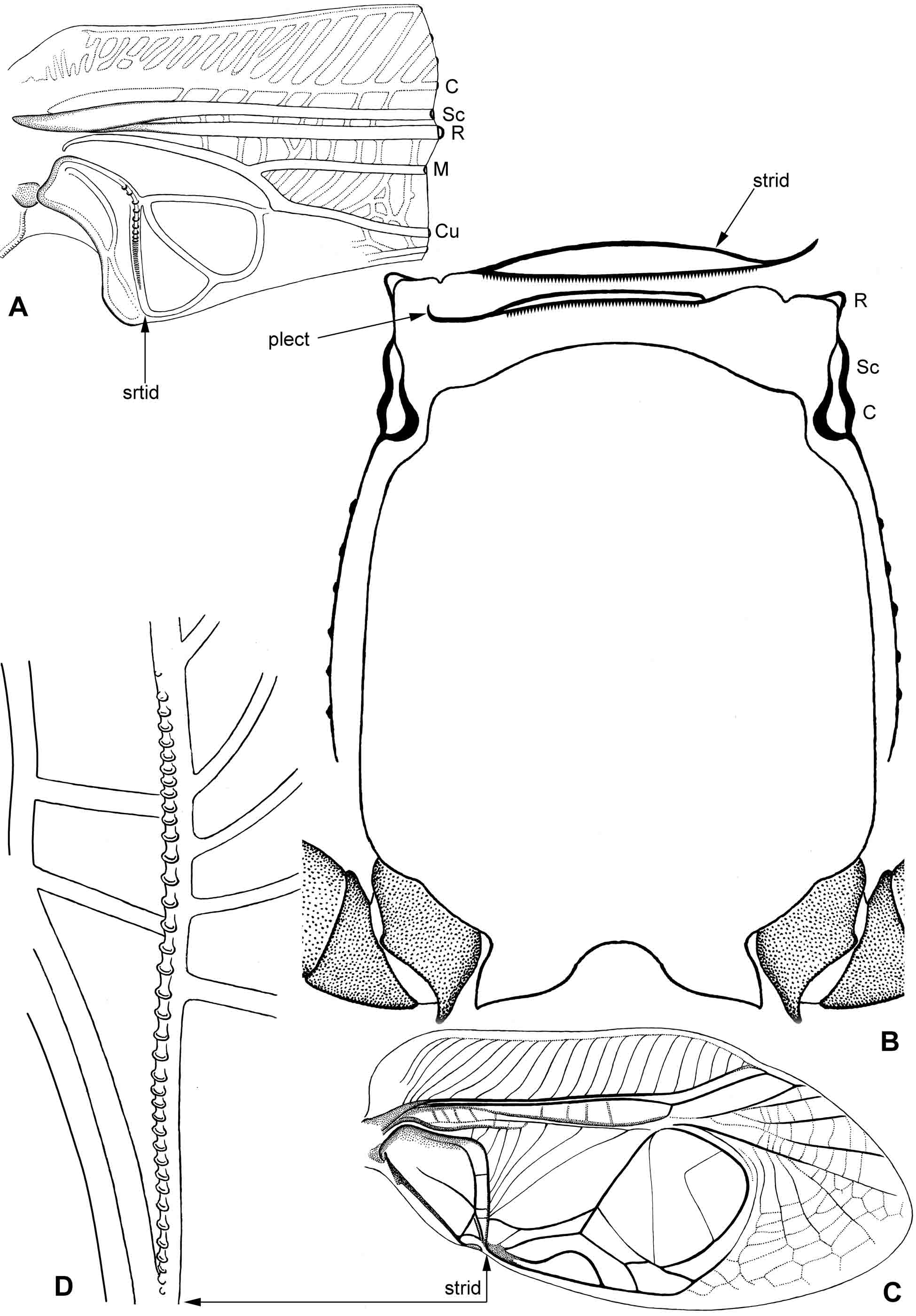 Рис. 8.5.4. Saltatoria-Dolichocera. Стридуляционный аппарат Striduloptera. A – Tettigensifera: Conocephalus sp.: проксимальная часть левого надкрылья, вентрально. B – Tettigensifera: Tettigonia cantans (Fuessly 1775 [Gryllus]). Поперечный разрез среднегруди самца имаго со сложенными крыльями на уровне стридуляционных жилок и плектрумов сложенных надкрыльев; фрагмент ноги за плоскостью среза пунктирован. C–D – Gryllensifera: Phaloria (Papuloria) aspersa Gorochov 1996: C – переднее крыло самца имаго, вентрально; D – его стридуляционная жилка. Условные обозначения: plect – плектрум; strid – стридуляционная жилка.