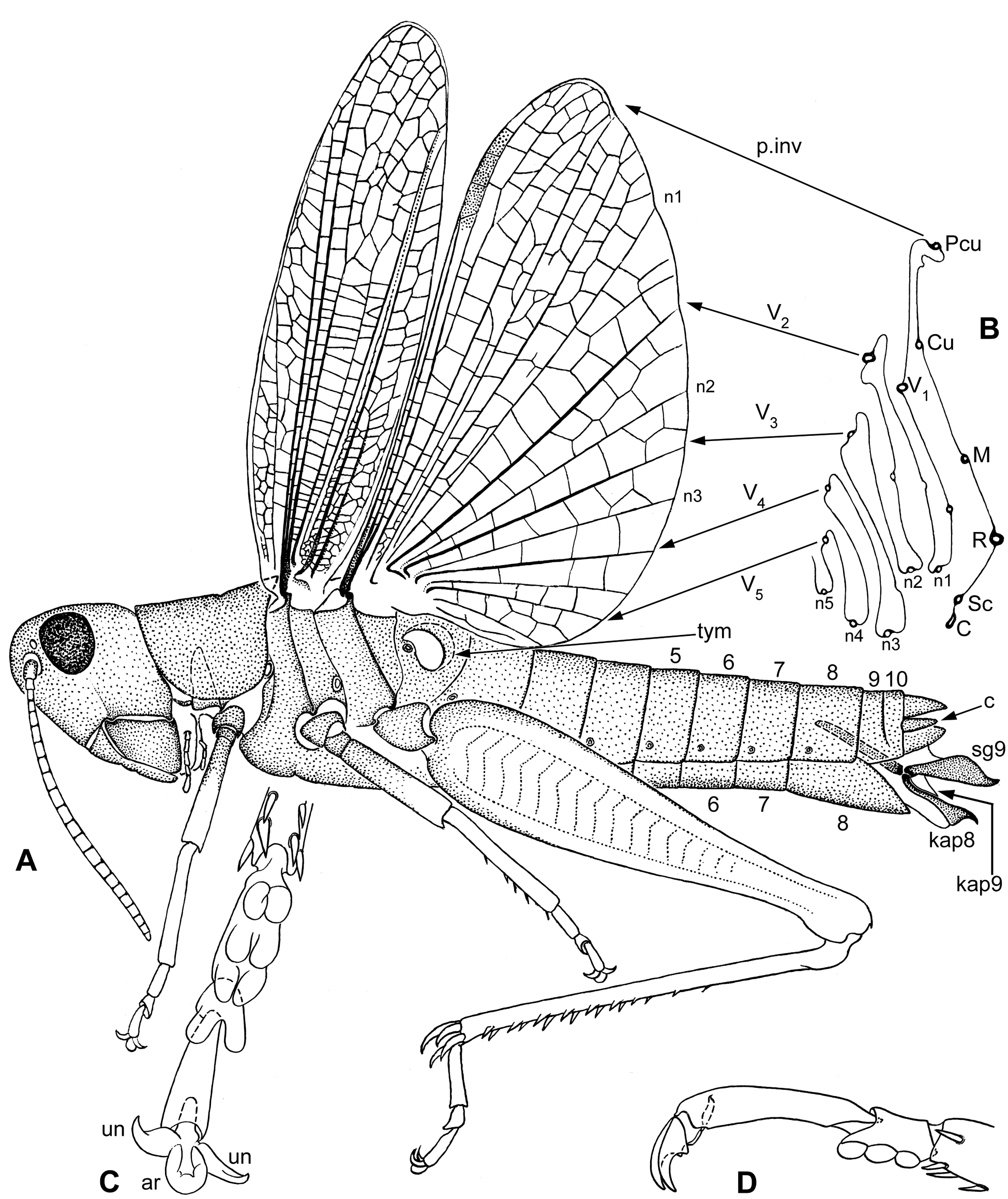 Ðèñ. 8.5.5. Saltatoria-Caelifera. A–B – Chorthippus montanus (Charpentier 1825 [Gryllus]), ñàìêà èìàãî: A – ëàòåðàëüíî (ïðåðûâèñòûìè ëèíèÿìè ïîêàçàíû: êðèïòîïëåéðèò (â ïåðåäíåãðóäè), ñêðûòûé äîðñàëüíî-çàäíèé êðàé òèìïàíàëüíîé ìåìáðàíû (â ïåðâîì ñåãìåíòå áðþøêà) è àïîäåìà ÿéöåêëàäà (â çàäíåé ÷àñòè áðþøêà); B – ïîïåðå÷íûé ñðåç ñëîæåííîãî çàäíåãî êðûëà (ñòðåëêè óêàçûâàþò ñîîòâåòñòâóþùèå æèëêè íà ðèñ. A); Ñ – ëàïêà ïåðåäíåé íîãè ñ ïîäîøâåííîé ñòîðîíû. D – Tetrix subulata (Linnaeus 1758 [Gryllus Bulla]), ëàïêà ïåðåäíåé íîãè ñáîêó. Óñëîâíûå îáîçíà÷åíèÿ: 1–10 – ñåãìåíòû áðþøêà; ar – àðîëèé; c – öåðê; kap8, kap9 – êèíåòàïîôèçû VIII è IX ïàð (1-àÿ è 2-àÿ ñòâîðêè ÿéöåêëàäà); n1, n2, n3, n4, n5 – æèëêè, ïî êîòîðûì ïðîõîäÿò âîãíóòûå ñêëàäêè àíàëüíîãî âååðà; p.inv – èíâåðòàëÿðíàÿ ñêëàäêà; sg9 – ñòèëèãåð IX ïàðû (3-ÿ ñòâîðêà ÿéöåêëàäà); tym – ñëóõîâîé òèìïàíàëüíûé îðãàí; un – êîãîòîê.
