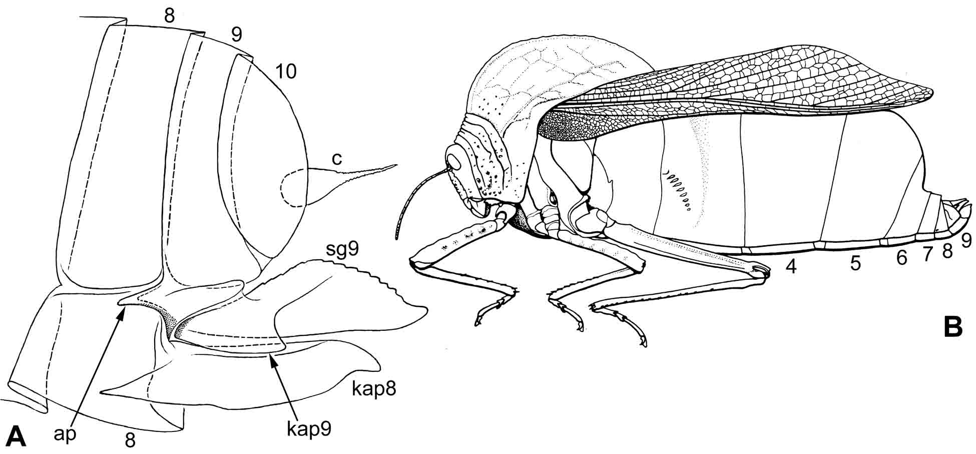 Ðèñ. 8.5.7. Saltatoria-Caelifera. A – ëè÷èíêà ïîñëåäíåãî âîçðàñòà Tetrix subulata (Linnaeus 1758 [Gryllus]), âåðøèíà áðþøêà è çà÷àòîê ÿéöåêëàäà, ìåäèàëüíûé ñðåç, âèä ìåäèàëüíî (ïîêàçàíà òîëüêî êóòèêóëà). B – Bullacris membracoides (Walker 1870 [Pneumora]), ñàìåö, ëàòåðàëüíî (ïî Dirsh 1965). Óñëîâíûå îáîçíà÷åíèÿ: 4–9 – ñåãìåíòû áðþøêà; ap – çà÷àòîê ëàòåðàëüíîé àïîäåìû; kap8, kap9 – VIII è IX êèíåòàïîôèçû (çà÷àòêè ïåðâûõ è âòîðûõ ñòâîðîê ÿéöåêëàäà); sg9 – çà÷àòîê IX ñòèëèãåðà.