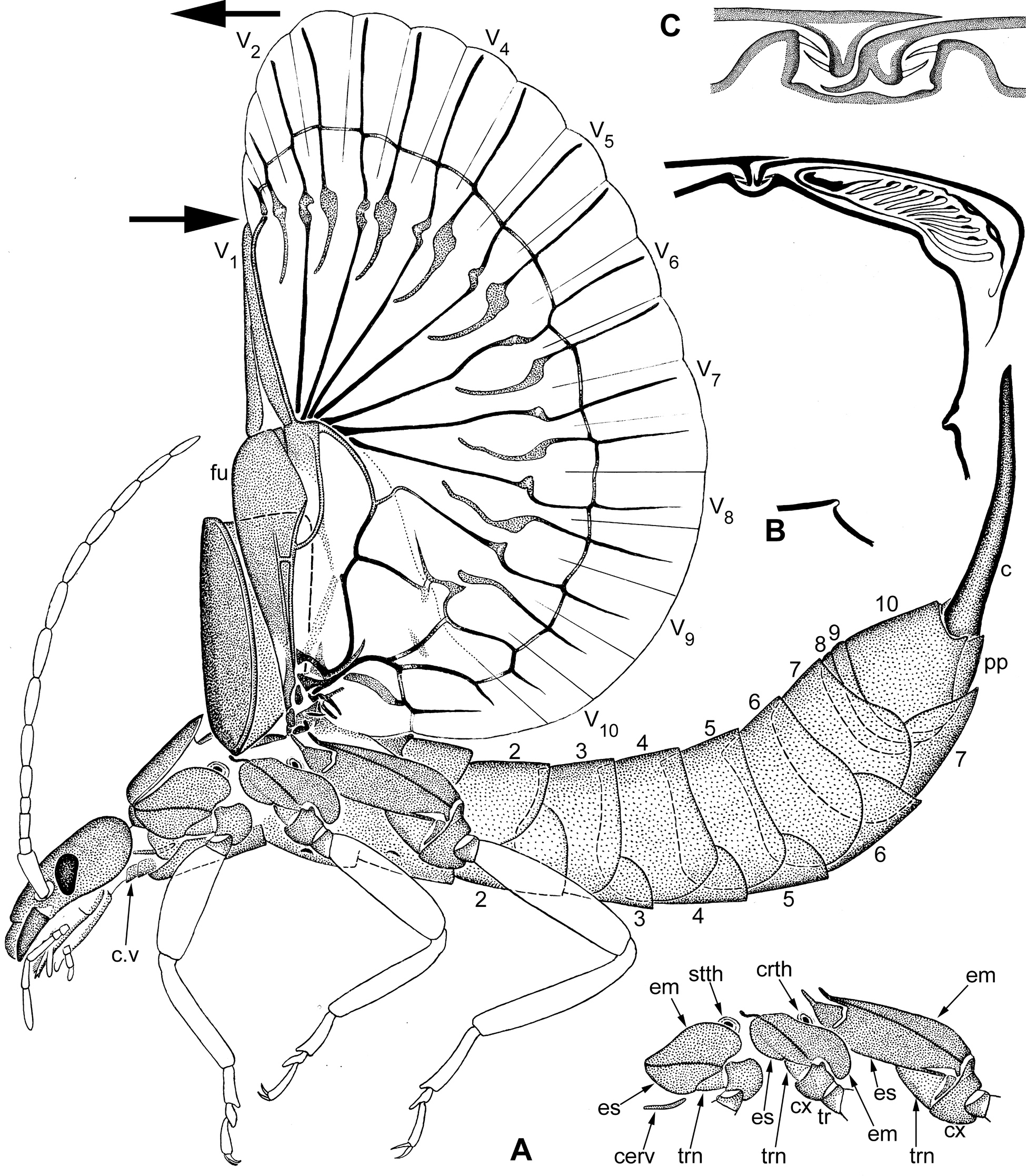 Ðèñ. 8.7.1. Dermatoptera: Forficula auricularia Linnaeus 1758. A – ñàìêà èìàãî, ëàòåðàëüíî (îòäåëüíî ïîêàçàíû ïëåéðèòû ãðóäè ñ îáîçíà÷åíèÿìè); B – ïîïåðå÷íûé ñðåç çàäíåãðóäè è îñíîâàíèÿ çàäíåé íîãè ñî ñëîæåííûìè ïåðåäíèìè è çàäíèìè êðûëüÿìè. C – ñöåïêà ñëîæåííûõ ïåðåäíèõ êðûëüåâ ñ ìåòàíîòóìîì, ïîïåðå÷íûé ñðåç, âèä ñçàäè. Óñëîâíûå îáîçíà÷åíèÿ: 1–10 – òåðãèòû è ñòåðíèòû I–X ñåãìåíòîâ áðþøêà; c – öåðê; cerv – ëàòåðàëüíûé öåðâèêàëüíûé ñêëåðèò; crth – êðèïòîòîðàêàëüíîå äûõàëüöå; c.v – âåíòðàëüíûé öåðâèêàëüíûé ñêëåðèò; cx – òàçèê; em – ýïèìåðîí; es – ýïèñòåðíóì; fu – ôóñòèñ; pp – ïàðàïðîêò; stth – ñòåíîòîðàêàëüíîå äûõàëüöå; tr – âåðòëóã; trn – òðîõàíòèí; áîëüøèå ñòðåëêè ïîêàçûâàþò íàïðàâëåíèå ñìåùåíèÿ ó÷àñòêîâ çàäíåãî êðûëà ïðè ñêëàäûâàíèè.