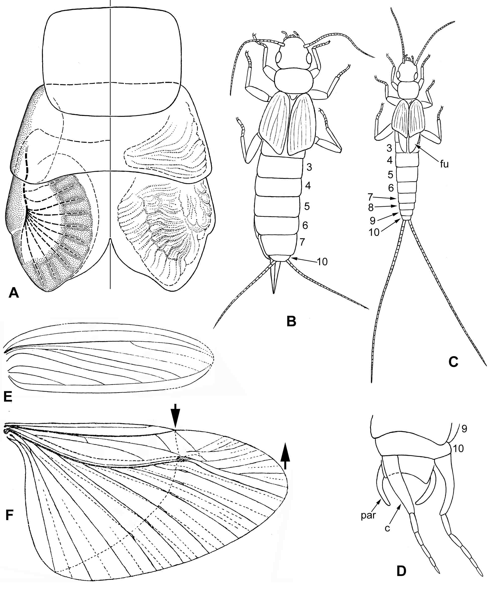 Рис. 8.7.2. Dermatoptera. A – Forficula auricularia, тергиты груди личинки последнего возраста: слева незрелая (прерывистыми линиями показаны трахеация заднего крыла и очертания областей, соответствующих будущим переднему и заднему крылу); справа перед линькой на имаго (прерывистыми и точечными линиями показаны переднее и заднее крылья имаго, смятые под личиночной кутикулой). B–D – ископаемые Archidermaptera (реконструкции по Вишняковой 1980 с изменениями): B – нелетающая самка имаго (на основе голотипа Asiodiplatys specoisus Vishniakova 1980); C – полнокрылый самец имаго (на основе голотипа Microdiplatys campodeiformis Vishniakova 1980); D – вершина брюшка самца имаго Dermapteron incertae [Martynov] Vishniakova 1980. E, F – Protelytroptera: Protelytron permianum Tillyard 1931: переднее и заднее крылья (складки показаны прерывистыми линиями; стрелки показывают направление смещения участков заднего крыла при складывании) (по Tillyard 1931). Условные обозначения: 3–10 – сегменты брюшка; c – церк; fu – фустис; par – парамер.