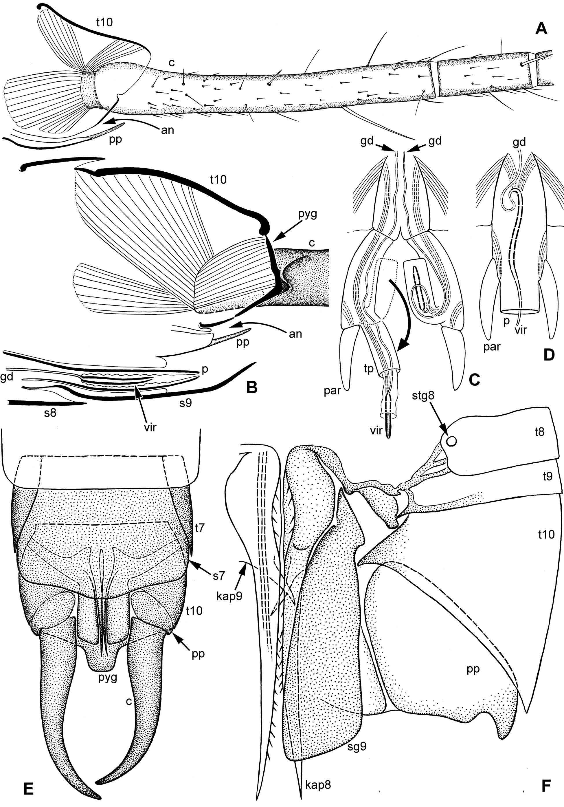 Ðèñ. 8.7.3. Dermatoptera. A – ëè÷èíêà Diplatys sp., ìåäèàëüíûé ñðåç äåñÿòîãî ñåãìåíòà áðþøêà è îñíîâàíèå ïðàâîãî öåðêà; B – ñàìåö èìàãî Forficula auricularia, ìåäèàëüíûé ñðåç IX–X ñåãìåíòîâ áðþøêà è îñíîâàíèå ïðàâîãî öåðêà; C – ñõåìà ñòðîåíèÿ äèàíäðè÷åñêîãî êîïóëÿòèâíîãî àïïàðàòà, äîðñàëüíî (ëåâûé òåëîïåíèñ ïîâåðíóò êàóäàëüíî, âèðãà âûäâèíóòà; ïðàâûé òåëîïåíèñ ñëîæåí â ïîêîÿùåìñÿ ïîëîæåíèè; âíóòðè ïåíèñà ïðåðûâèñòûìè ëèíèÿìè ïîêàçàíû ãîíîäóêòû è ïðîäîëüíûå ìûøöû; êîëüöåâûå ìûøöû íå ïîêàçàíû); D – ñõåìà ñòðîåíèÿ ìîíàíäðè÷åñêîãî êîïóëÿòèâíîãî àïïàðàòà (âíóòðè ïåíèñà ïðåðûâèñòûìè ëèíèÿìè ïîêàçàíû ãîíîäóêò è ïðîäîëüíûå ìûøöû; êîëüöåâûå ìûøöû íå ïîêàçàíû); E–F – ñàìêà èìàãî Echinosoma sp.: E – âåíòðàëüíàÿ ñòîðîíà VII–X ñåãìåíòîâ áðþøêà; F – òî æå, óâåëè÷åíî, VII ñòåðíèò áðþøêà óäàëåí (â ëåâîì êèíåòàïîôèçå ïðåðûâèñòîé ëèíèåé ïîêàçàíà âòîðè÷íàÿ ïðîäîëüíàÿ ìûøöà; îñòàëüíûå ìûøöû íå ïîêàçàíû). Óñëîâíûå îáîçíà÷åíèÿ: an – àíàëüíîå îòâåðñòèå; c – öåðê; kap8, kap9 – êèíåòàïîôèçû VIII è IX ïàð; gd – ñåìåííîé ïðîòîê; p – ïåíèñ; par – ïàðàìåð; pp – ïàðàïðîêò; pyg – ïèãèäèé; s7, s8, s9 – VII–IX ñòåðíèòû áðþøêà; sg9 – ñòèëèãåð IX ñåãìåíòà áðþøêà; stg8 – äûõàëüöå VIII ñåãìåíòà áðþøêà; t7, t8, t9, t10 – òåðãèòû VII–X ñåãìåíòîâ áðþøêà; tp – òåëîïåíèñ; vir – âèðãà.