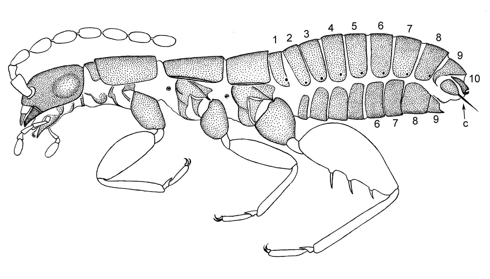 Ðèñ. 9.1.1. Zoraptera: Zorotypus huxleyi Bolivar y Pieltain & Coronado 1963, áåñêðûëàÿ ôîðìà, ñàìåö èìàãî (ùåòèíêè íå íàðèñîâàíû). Óñëîâíûå îáîçíà÷åíèÿ: 1–10 – I–X ñåãìåíòû áðþøêà, c – öåðê.