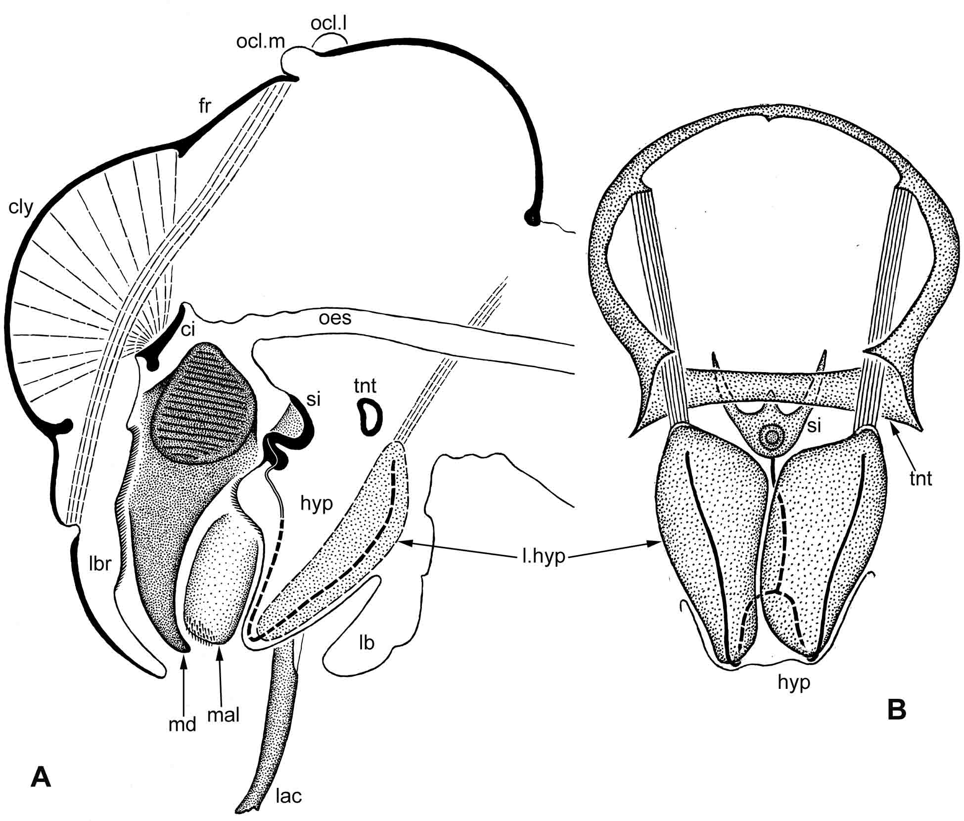 Ðèñ. 9.2.3. Eupsocida: Metylophorus nebulosus (Stephens 1836 [Psocus]). A – ìåäèàëüíûé ñðåç ãîëîâû; ïðåðûâèñòîé ëèíèåé ïîêàçàíû íàõîäÿùèåñÿ âíå ïëîñêîñòè ñðåçà ñêëåðèòû (ãèïîôàðèíãåàëüíàÿ ïëàñòèíêà è ïàðíàÿ âåòâü ãèïîôàðèíãåàëüíîãî ëèãàìåíòà) è ìûøöû (ôðîíòî-ëàáðàëüíàÿ, öèáàðèàëüíàÿ è êðàíèî-ãèïîôàðèíãåàëüíàÿ); ñïëîøíîé ëèíèåé ñ ïóíêòèðîâêîé ïîêàçàíû âèäèìûå ïîâåðõíîñòè ïàðíûõ ïðèäàòêîâ (ìàíäèáóëû, ìàêñèëëÿðíîé ìàëû è ëàöèíèè). B – ñêëåðèòû ãèïîôàðèíêñà è ãëîòêè, çàòûëî÷íîå îòâåðñòèå è çàäíèé òåíòîðèàëüíûé ìîñò (âèä ñçàäè); ïîêàçàíû êðàíèî-ãèïîôàðèíãåàëüíûå ìûøöû (ñì. ðèñ. 9.2.4C). Óñëîâíûå îáîçíà÷åíèÿ: ci – öèáàðèàëüíûé ñêëåðèò; cly – êëèïåóñ; fr – ëîá; hyp – ãèïîôàðèíêñ; lac – ëàöèíèÿ ìàêñèëëû; lb – íèæíÿÿ ãóáà; lbr – âåðõíÿÿ ãóáà; l.hyp – ãèïîôàðèíãåàëüíàÿ ïëàñòèíêà; mal – ìàëà ìàêñèëëû; md – ìàíäèáóëà; ocl.l – ëàòåðàëüíûé ïðîñòîé ãëàçîê; ocl.m – ìåäèàëüíûé ïðîñòîé ãëàçîê; oes – ïèùåâîä; si – ñèòîôîðíûé ñêëåðèò; tnt – çàäíèé òåíòîðèàëüíûé ìîñò.