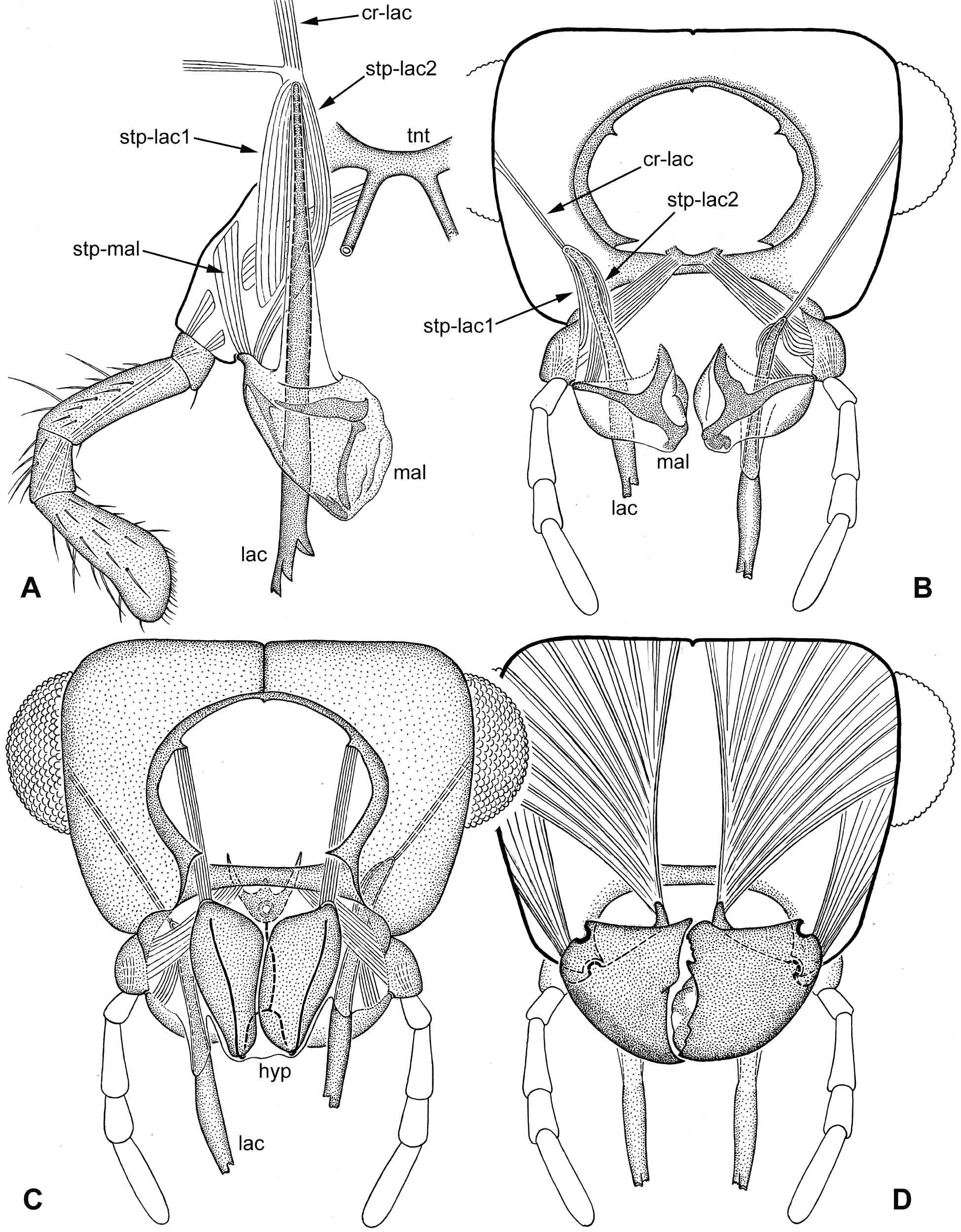 Рис. 9.2.4. Максиллы Parapsocida и Eupsocida. A – Parapsocida: Papuapsocus sp.: правая максилла, спереди (стипес показан в разрезе). B–D – Eupsocida: Metylophorus nebulosus (Stephens 1836 [Psocus]): B – срез головы впереди максилл, вид спереди (показаны только максиллярные мышцы); C – голова сзади, нижняя губа удалена (показаны только мышцы максилл и гипофаринкса); D – срез головы впереди мандибул, вид спереди (показаны только мандибулярные мышцы). Условные обозначения: cr-lac – краниальная мышца лацинии; hyp – гипофаринкс; lac – лациния максиллы; mal – мала; tnt – тенториум; stp-lac1 – стипитальная мышца лациниальная; stp-lac2 – малярная мышца лацинии; stp-mal – стипито-малярная мышца.