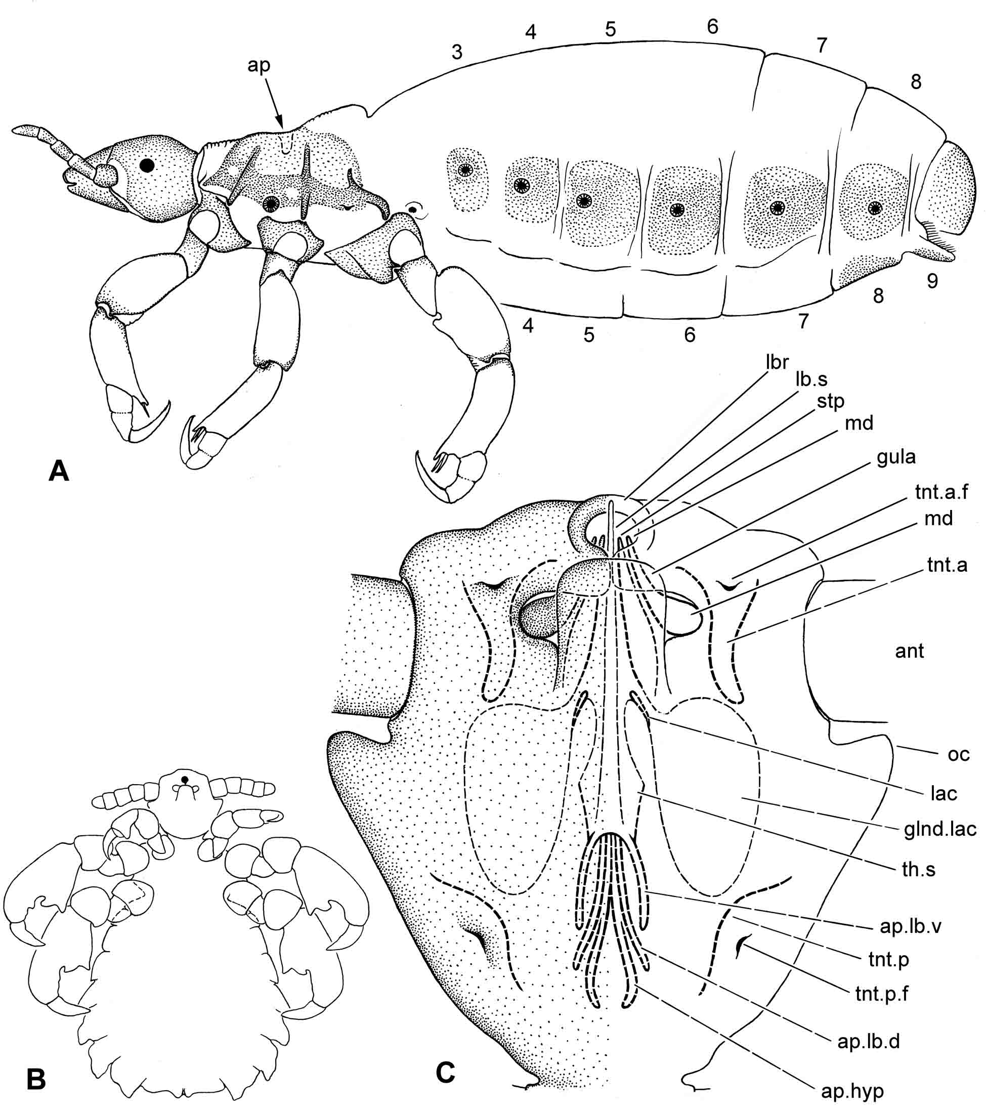 Ðèñ. 9.3.2. Siphunculata. A – Pediculus humanus capitus Degeer 1778, ñàìêà èìàãî, ëàòåðàëüíî (ùåòèíêè íå ïîêàçàíû; ïðåðûâèñòîé ëèíèåé ïîêàçàíà ìåäèàëüíàÿ íåïàðíàÿ äîðñàëüíàÿ àïîäåìà, îáùàÿ äëÿ òðåõ ñåãìåíòîâ ãðóäè). B–C – Hybophthirus orycteropodi Enderlein 1909: B – ëè÷èíêà, âåíòðàëüíî (ïî ôîòîãðàôèè èç Keler 1962); C – ãîëîâà ñàìêè èìàãî, âåíòðàëüíî; ñõåìà íà îñíîâå ôîòîãðàôèé è ðèñóíêîâ èç Keler (1962) è Troster (1990); ïðîïîðöèè íåñêîëüêî èñêàæåíû, ÷òîáû ïîêàçàòü âçàèìîðàñïîëîæåíèå ðîòîâûõ ÷àñòåé; ñêðûòûå ÷àñòè ïîêàçàíû ïðåðûâèñòîé ëèíèåé. Óñëîâíûå îáîçíà÷åíèÿ: 1–10 – òåðãèòû è ñòåðíèòû áðþøêà; ant – àíòåííà; ap – íåïàðíàÿ àïîäåìà ãðóäè; ap.hyp – àïîäåìà ãèïîôàðèíãåàëüíîãî ñòèëåòà; ap.lb.d – äîðñàëüíàÿ àïîäåìà ëàáèàëüíîãî ñòèëåòà; ap.lb.v – âåíòðàëüíàÿ àïîäåìà ëàáèàëüíîãî ñòèëåòà; glnd.lac – «ëàöèíèàëüíàÿ æåëåçà»; lac – ëàöèíèÿ ìàêñèëëû; lbr – âåðõíÿÿ ãóáà; lb.s – ëàáèàëüíûé ñòèëåò; md – ìàíäèáóëà; oc – ãëàçíîé áóãîð; stp – ñòèïåñ ìàêñèëëû; th.s – õîáîòêîâîå âëàãàëèùå; tnt.a – ïåðåäíÿÿ ðóêà òåíòîðèóìà; tnt.a.f – ïåðåäíÿÿ òåíòîðèàëüíàÿ ÿìêà; tnt.p – çàäíÿÿ ðóêà òåíòîðèóìà; tnt.p.f – çàäíÿÿ òåíòîðèàëüíàÿ ÿìêà.
